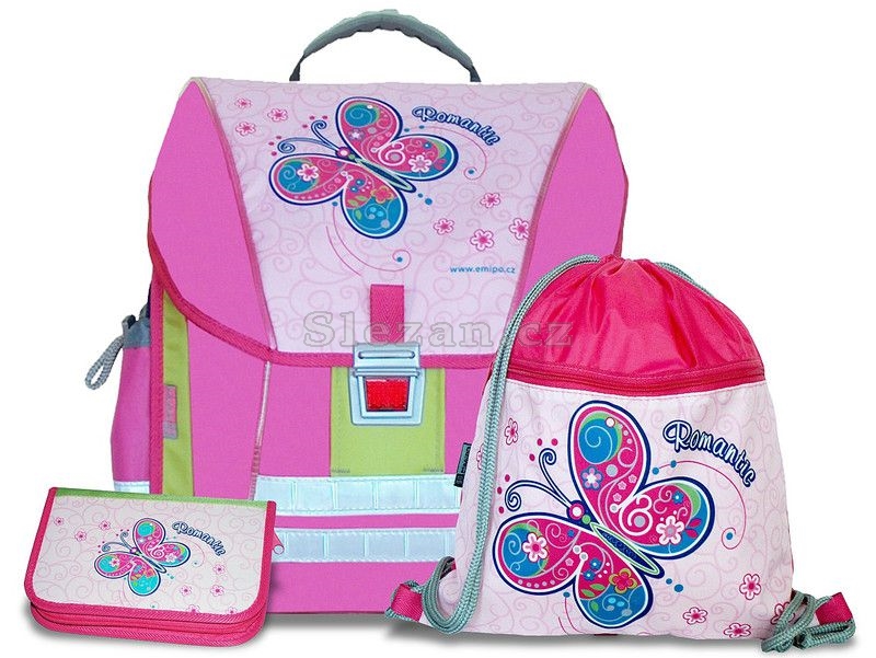 školní batoh, sáček s kapsou na zip a penál s dvěma klopami.
