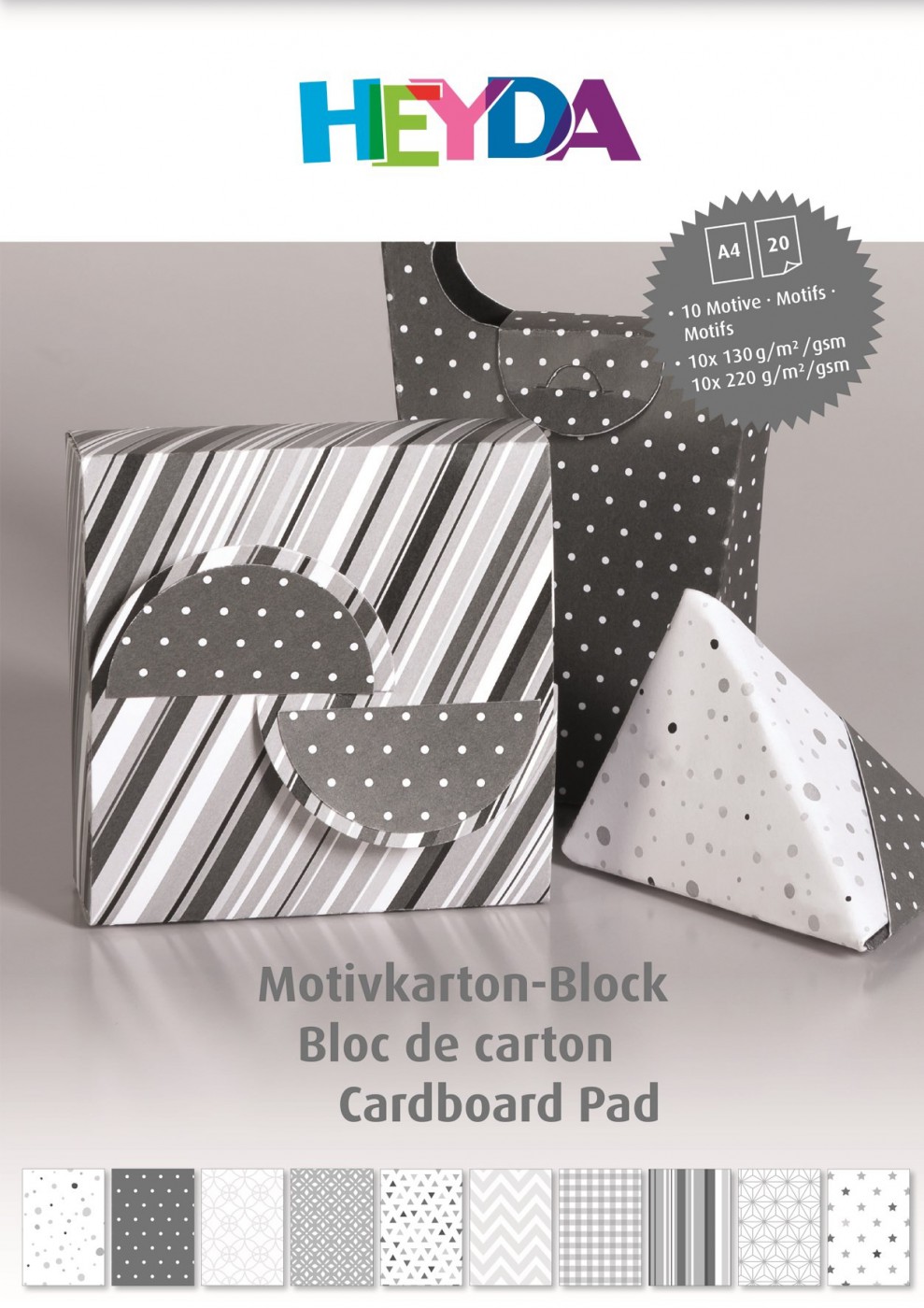 Blok barevných papírů, 10 motivů ve 2 gramážích, převážně oboustranně potištěny.