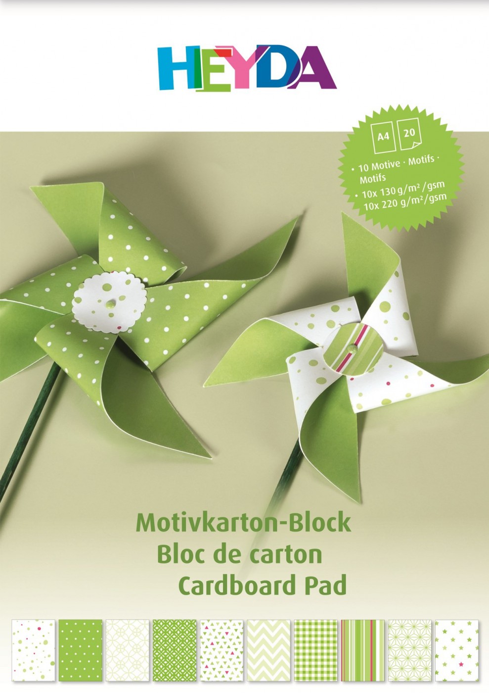 Blok barevných papírů, 10 motivů ve 2 gramážích, převážně oboustranně potištěny.
