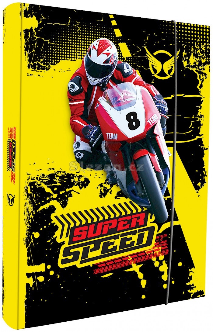 Box na sešity formátu A4, je zajištěný vnitřní klopou a gumičkou proti vypadnutí.