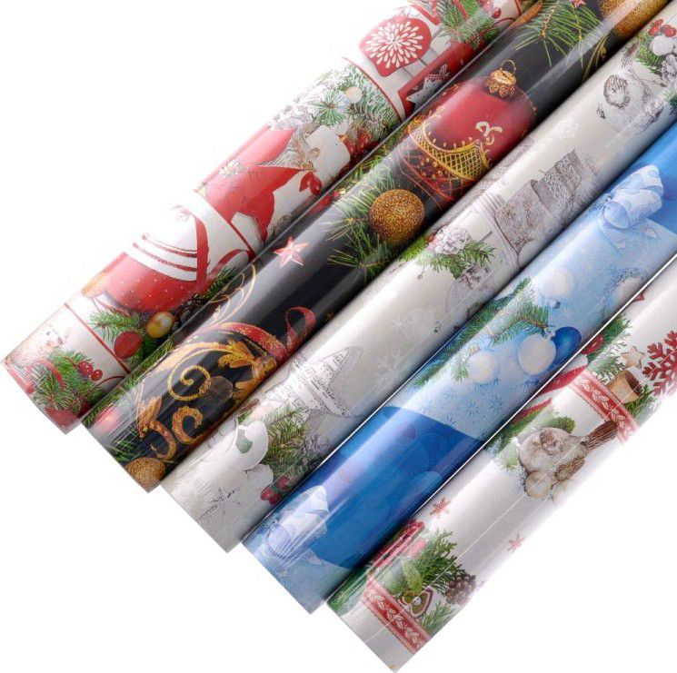 Dárkový papír v roli s tradičními vánočními motivy.