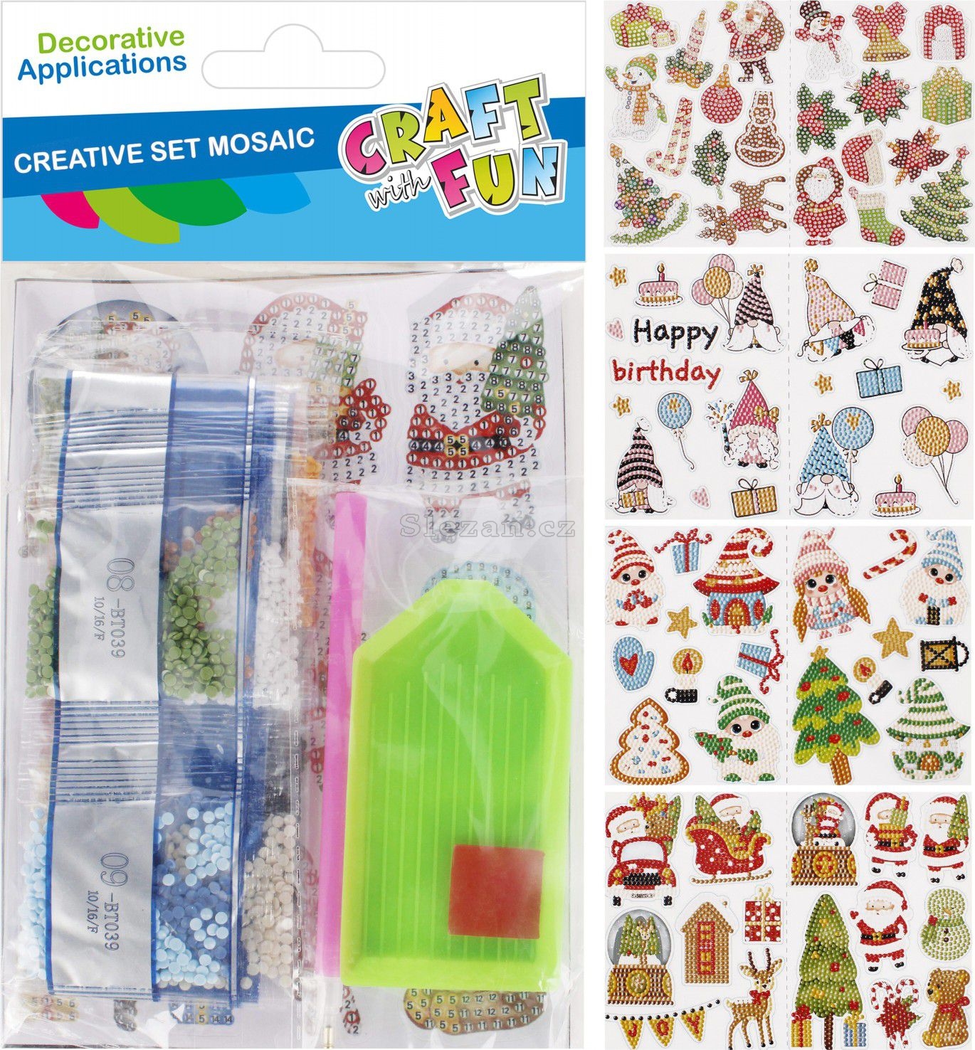 Obsah balení: 15x vánoční dekorace, mix vzorů, krystaly ve 13 barvách, 1x pinzeta na nanášení krystalů, nádobka na krystaly.