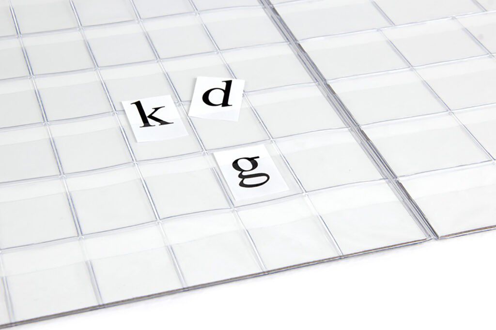Plastové školní desky na písmenka pro prvňáčky, díky nimž jsou písmenka chráněná před poškozením, ohýbáním nebo znečištěním.