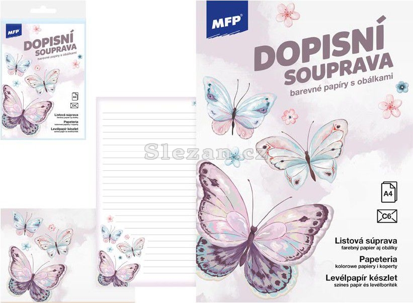 Dopisní souprava s obrázkem motýlů. Píšete rádi dopisy svým známým? Pořiďte si u nás krásné dopisní papíry s různými motivy a nezapomeňte ani na psací potřeby. BALENÍ OBSAHUJE: - 10 potištěných dopisních papírů formátu A4 - 5 barevných poštovních obálek FORMÁT: A4 PROVEDENÍ: linkovaný Uvedená cena je za 1 balení. Dodáváme v nádherné papírové krabičce. K dokonalosti je vše baleno v průhledném obalu se závěsem.