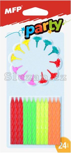 BALENÍ OBSAHUJE: - 24 ks neon barevných svíček (zelená, červená, žlutá, růžová) - 12 ks barevných držáků