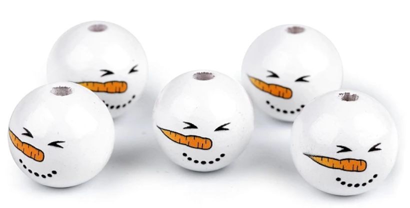 Dřevěné korálky s malovaným obličejem sněhuláka.