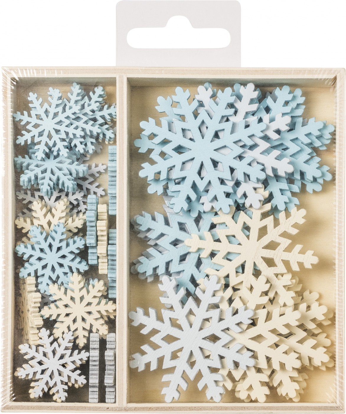 Dřevěné ozdoby v boxu, 54 ks - vločky