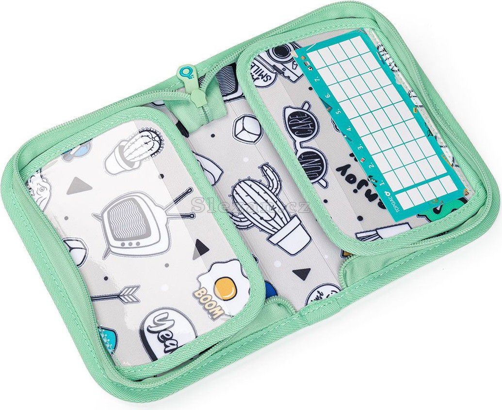 Jednopatrové školní pouzdro se dvěma klopnami je vybaveno 21 klasickými gumovými úchyty na pastelky a fixy, třema širšími úchyty na pravítko, kružítko či nůžky a dvěma většími úchyty na gumu a ořezávátko. Pod klopou z průhledné folie najdete rozvrh hodin, druhé poslouží třeba i na taháky :-)