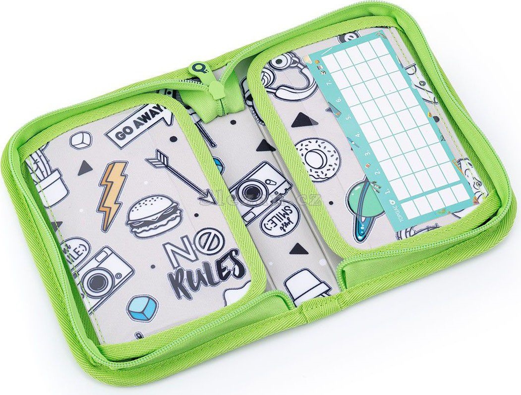 Jednopatrové školní pouzdro se dvěma klopnami je vybaveno 21 klasickými gumovými úchyty na pastelky a fixy, třema širšími úchyty na pravítko, kružítko či nůžky a dvěma většími úchyty na gumu a ořezávátko. Pod klopou z průhledné folie najdete rozvrh hodin, druhé poslouží třeba i na taháky :-)