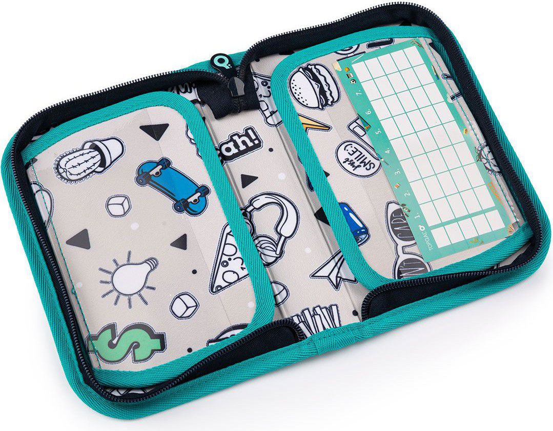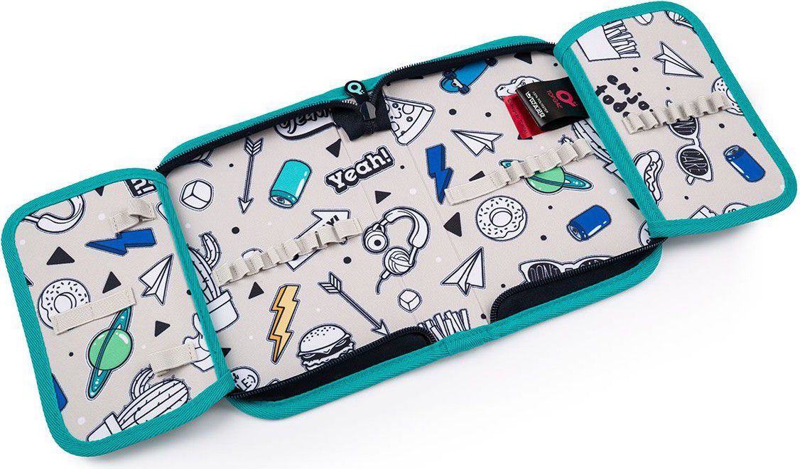 Jednopatrové školní pouzdro se dvěma klopnami je vybaveno 21 klasickými gumovými úchyty na pastelky a fixy, třema širšími úchyty na pravítko, kružítko či nůžky a dvěma většími úchyty na gumu a ořezávátko. Pod klopou z průhledné folie najdete rozvrh hodin, druhé poslouží třeba i na taháky :-)