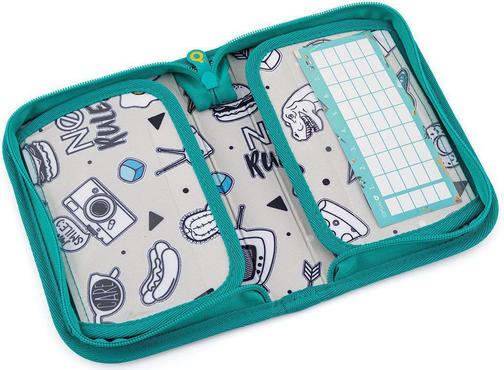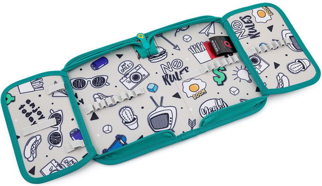 Jednopatrové školní pouzdro se dvěma klopami. Díky gumovým úchytům se do nich vejde celkem dvacetjedna pastelek, tužek a fixek. Tři širší úchyty poslouží na pravítko, kružítko či nůžky. Dva větší na gumu a ořezávátko.
