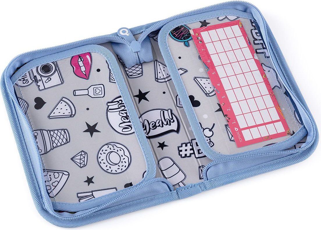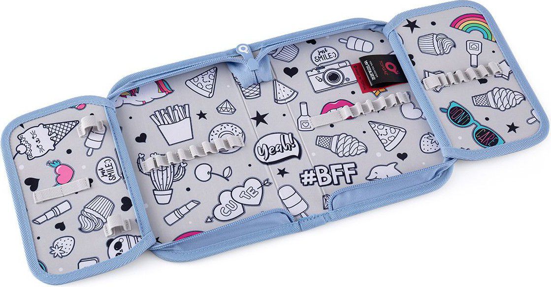 Jednopatrové školní pouzdro se dvěma klopami. Díky gumovým úchytům se do nich vejde celkem dvacetjedna pastelek, tužek a fixek. Tři širší úchyty poslouží na pravítko, kružítko či nůžky. Dva větší na gumu a ořezávátko.