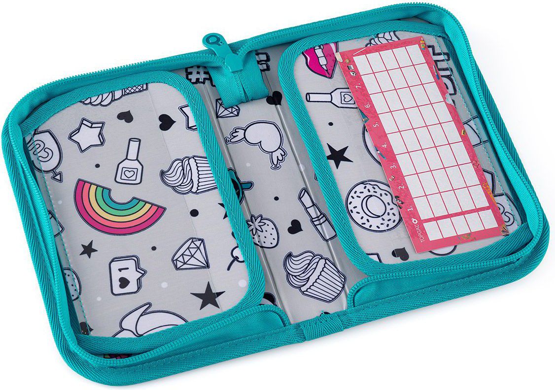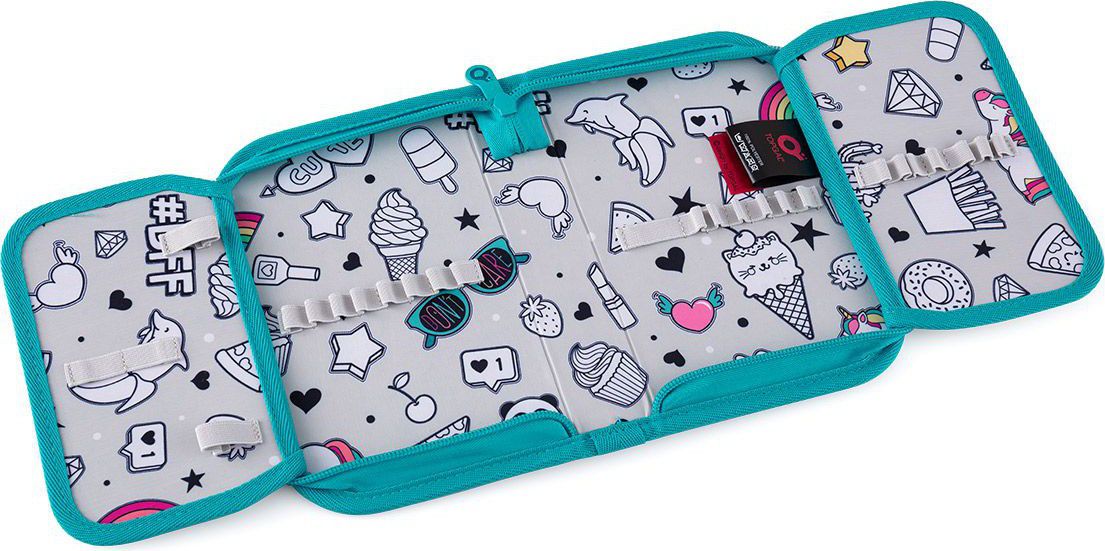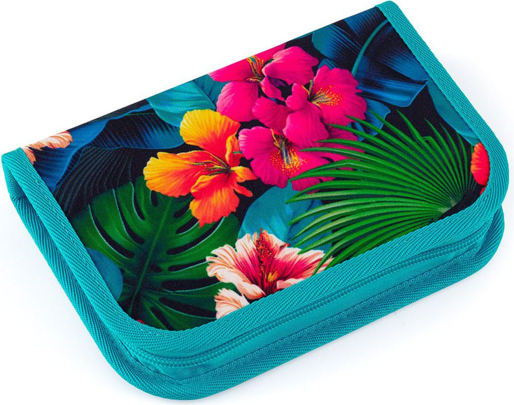 Jednopatrové školní pouzdro se dvěma klopami. Díky gumovým úchytům se do nich vejde celkem dvacetjedna pastelek, tužek a fixek. Tři širší úchyty poslouží na pravítko, kružítko či nůžky. Dva větší na gumu a ořezávátko.