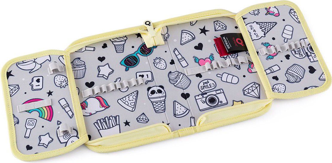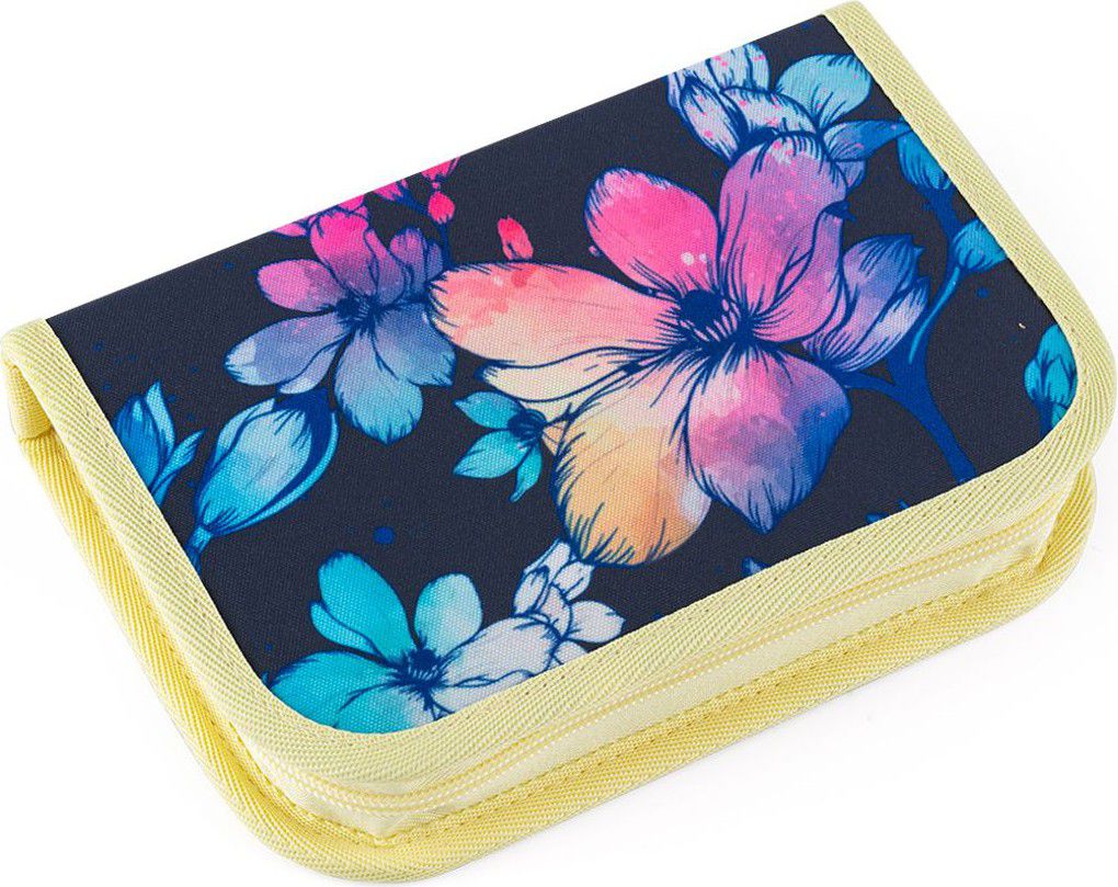 Jednopatrové školní pouzdro se dvěma klopami. Díky gumovým úchytům se do nich vejde celkem dvacetjedna pastelek, tužek a fixek. Tři širší úchyty poslouží na pravítko, kružítko či nůžky. Dva větší na gumu a ořezávátko.