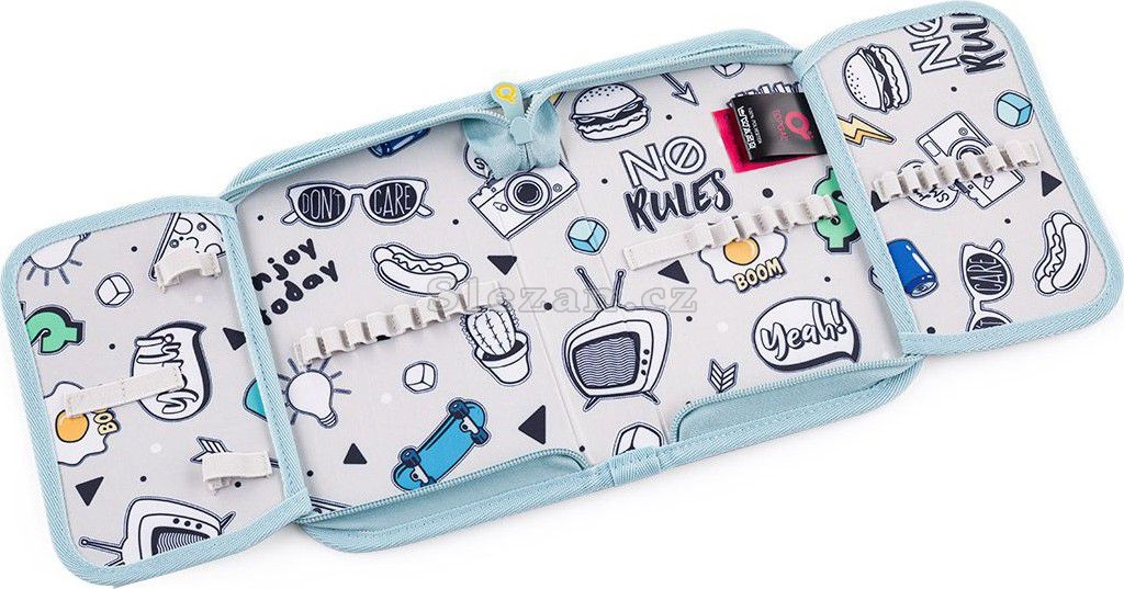 Jednopatrové školní pouzdro se dvěma klopami. Díky gumovým úchytům se do nich vejde celkem dvacetjedna pastelek, tužek a fixek. Tři širší úchyty poslouží na pravítko, kružítko či nůžky. Dva větší na gumu a ořezávátko.