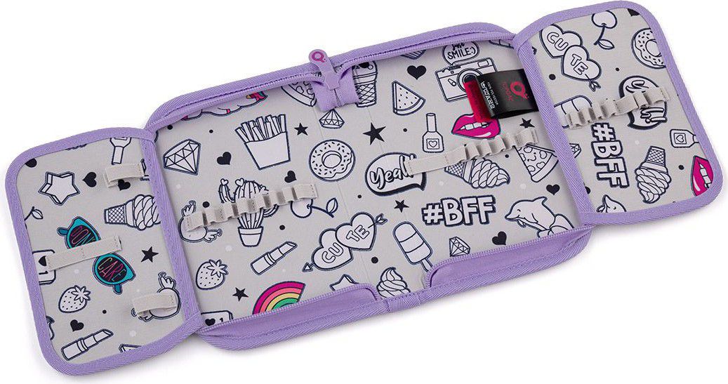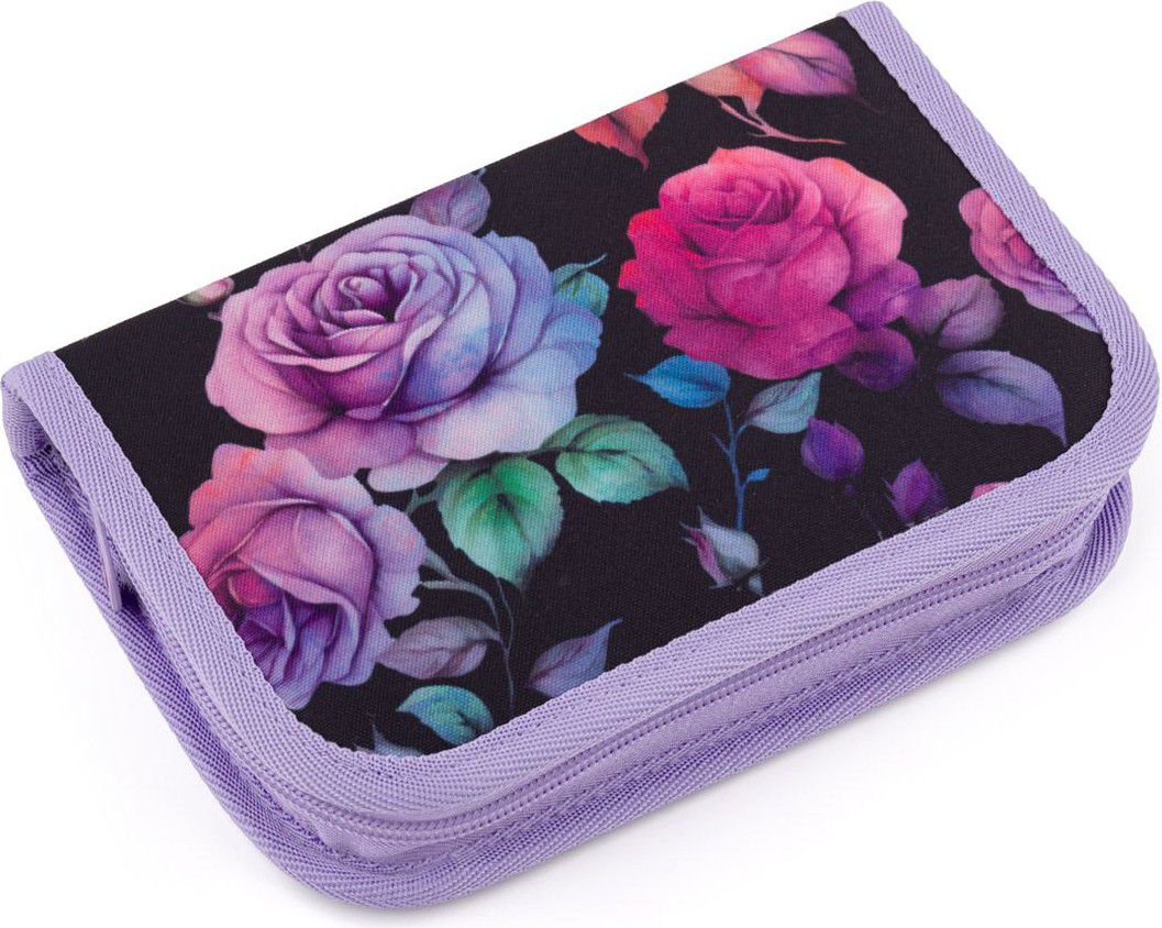 Jednopatrové školní pouzdro se dvěma klopami. Díky gumovým úchytům se do nich vejde celkem dvacetjedna pastelek, tužek a fixek. Tři širší úchyty poslouží na pravítko, kružítko či nůžky. Dva větší na gumu a ořezávátko.