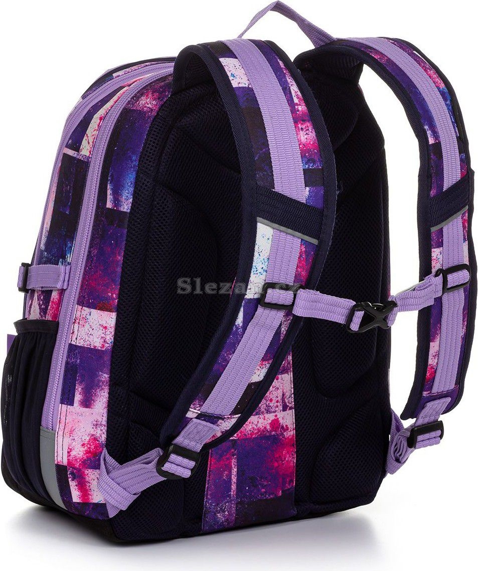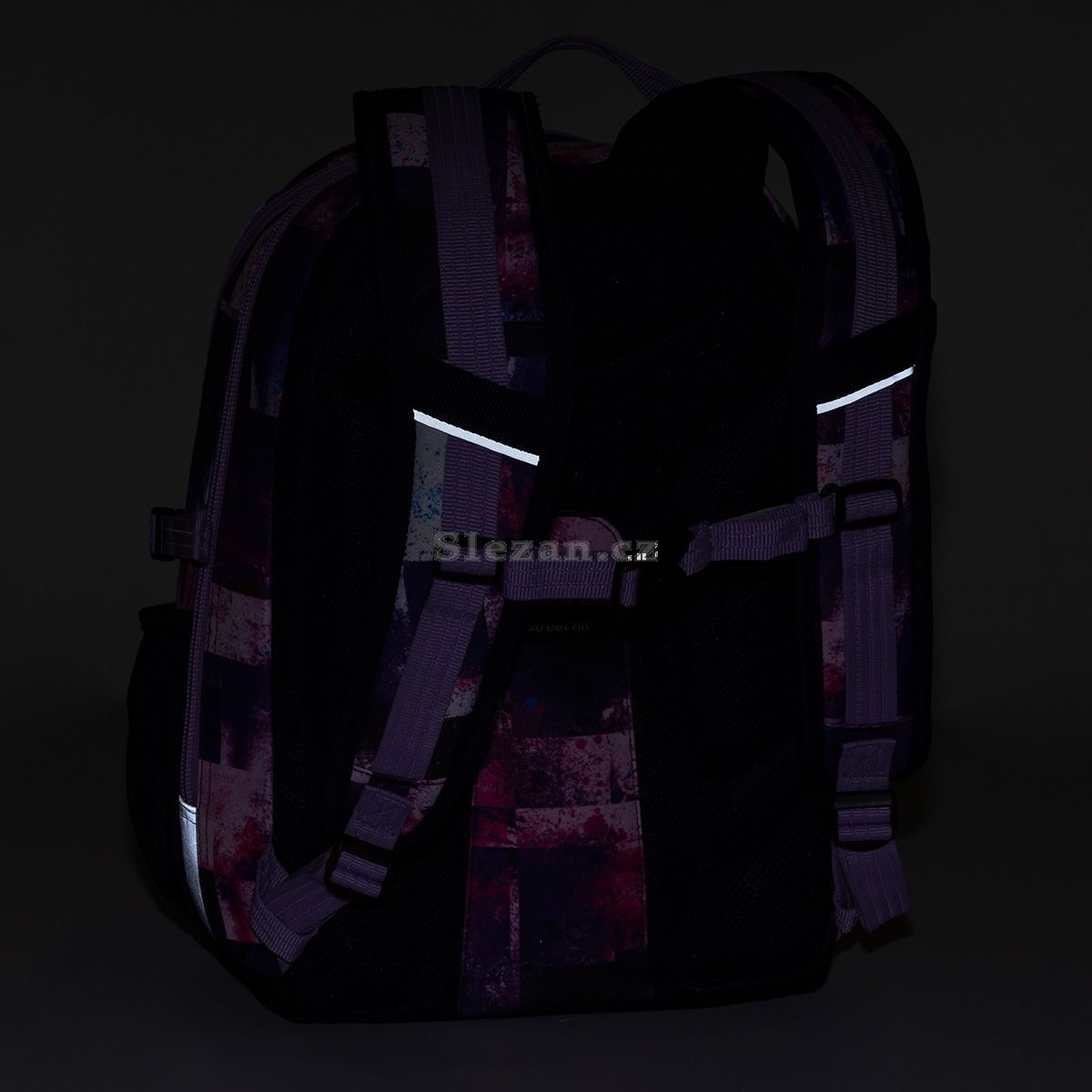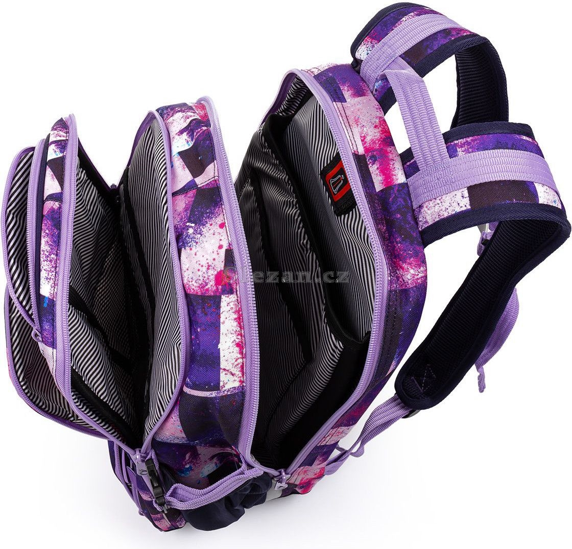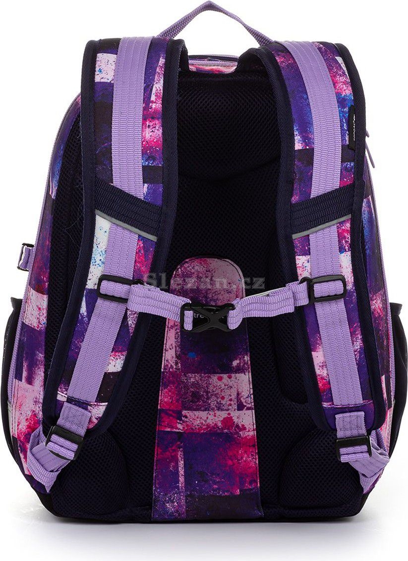nejoblíbenější střih v novém designu vhodný od 150 cm na ZŠ, SŠ, ale i studentky VŠ pevná záda, velký objem Střih YUMI je prostě naše dvoukomorová stálice. Letos batoh přinášíme v novém růžovo fialovém potisku s tmavě modrými pásy na čele batohu. Kdybyste nevěděli, původně pásy na suchý zip sloužily na přenášení skateboardu, ale dnes si na ně můžete zavěsit prakticky cokoliv. Skate ale samozřejmě taky, takže bude sloužit dobře nejen do školy, ale i na volný čas! Uvnitř batohu je ve dvou objemných komorách spousta místa. Zadní komora je širší a jsou v ní všité dvě polstrované kapsy - užijete je buď na přenášení notebooku do velikosti 15,4”, tabletu, nebo tam dáte prostě složky a sešity A4, které nechcete, aby se zmuchlaly. Menší kapsa je fajn třeba na telefon, nebo powerbanku. Nebo ji využijete na kosmetiku? No proč ne… Přední komora je o něco užší, ale je v ní ještě síťová kapsa na zip a karabina na klíče. Všechny další drobnosti jde skládat do tří menších kapsiček na čele batohu. Na obou bocích batohu jsou síťové kapsy na lahev na pití - jedna z nich je doplněna kompresním popruhem, takže se do ní vejde pohodlně i větší PETka. Reflexní prvky na batohu jsou umístěné tak, že si jich na první pohled skoro nevšimnete. Jsou ale na čele, bocích i na ramenních popruzích batohu. Ty jsou polstrované, tvarované a utahovatelné, takže můžete nosit denně i těžký náklad. Záda batohu jsou anatomicky tvarovaná a polstrovaná, vyztužena hliníkovým prutem, který drží správný anatomický tvar zad batohu. Něco navíc: zátěr proti dešti kovové taháčky pevné nepropustné dno z TOPDURY poutko na přenášení batohu v ruce PS: K batohu můžete dokoupit v setu nebo zvlášť i oválný penál ETUE 20033 ve stejném designu.