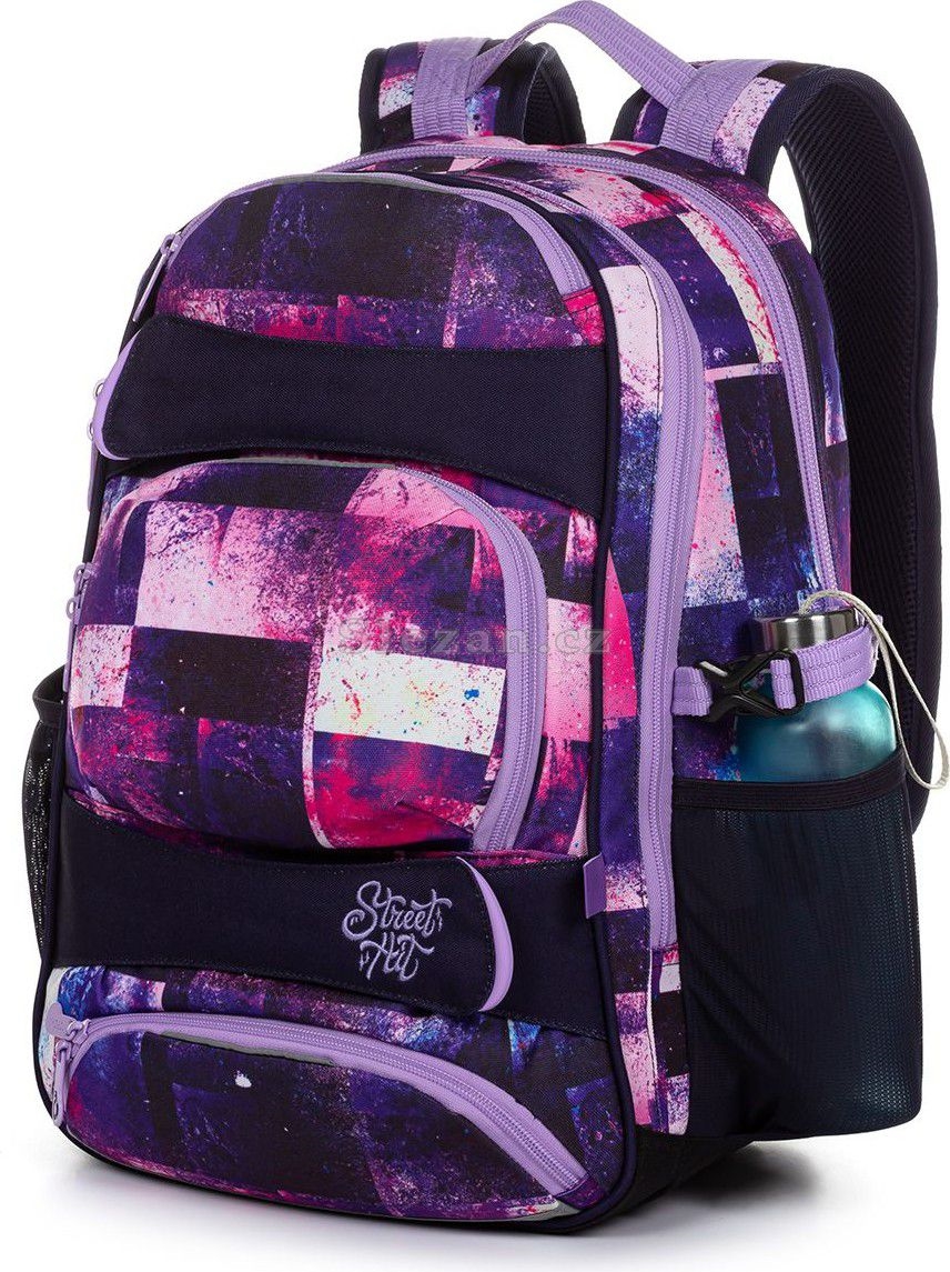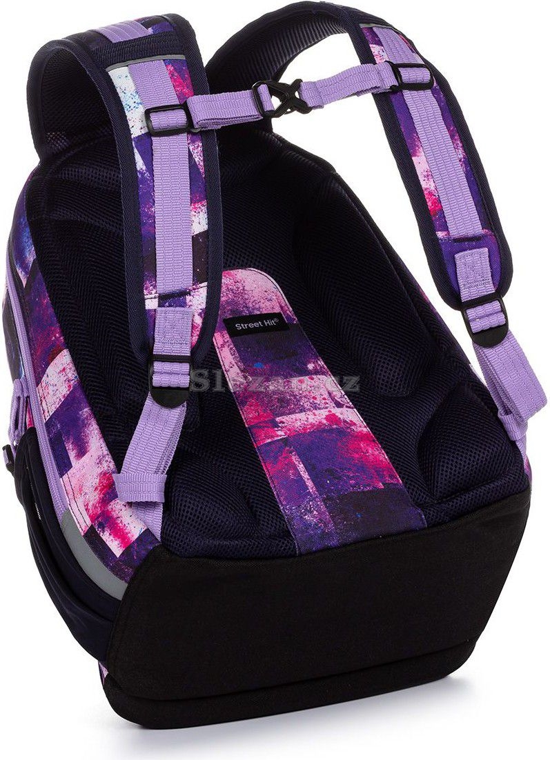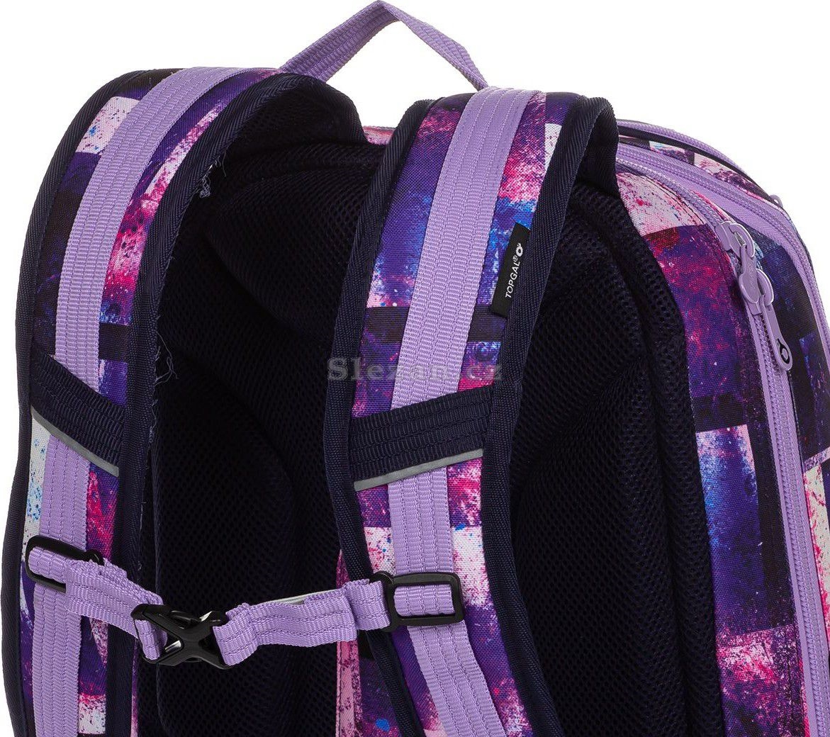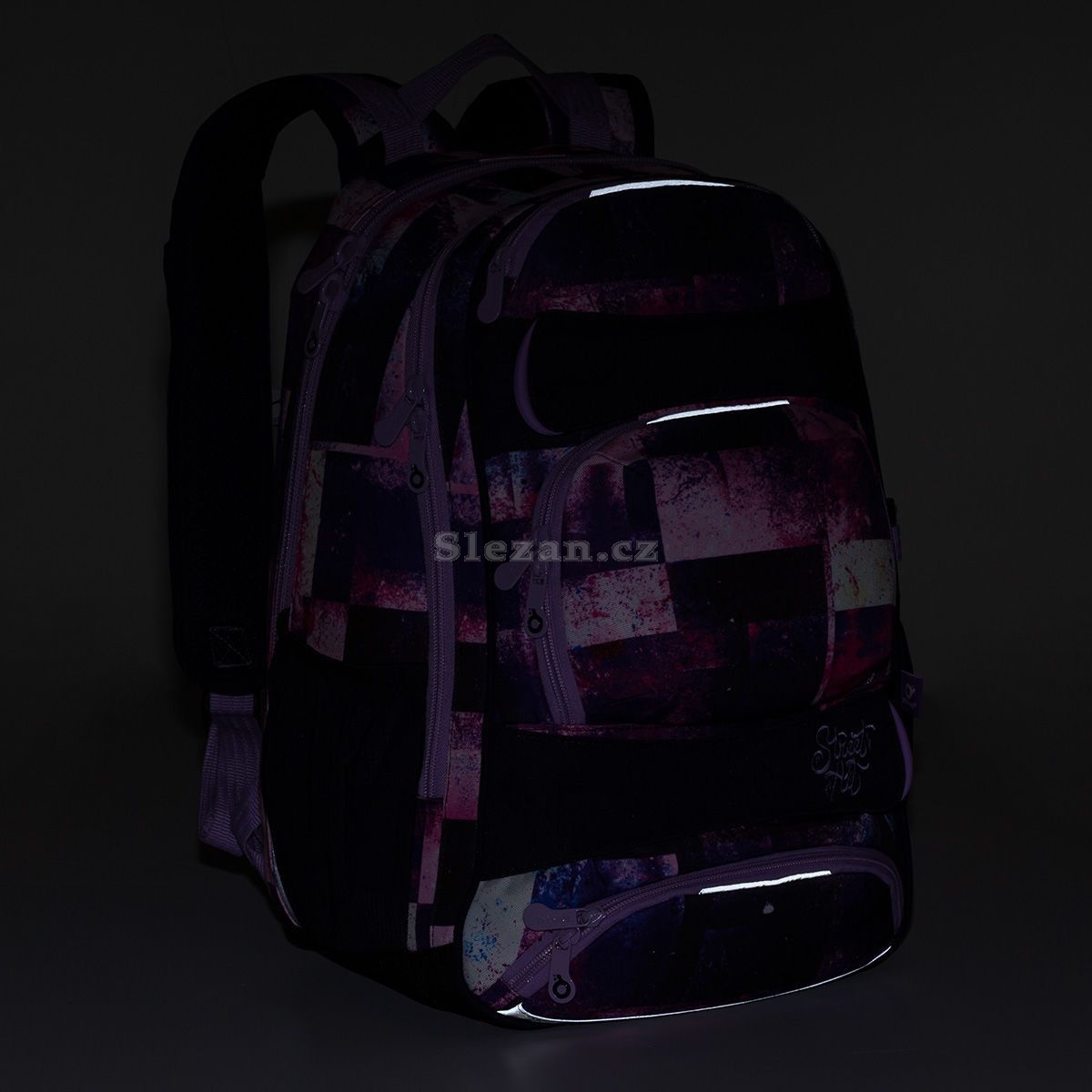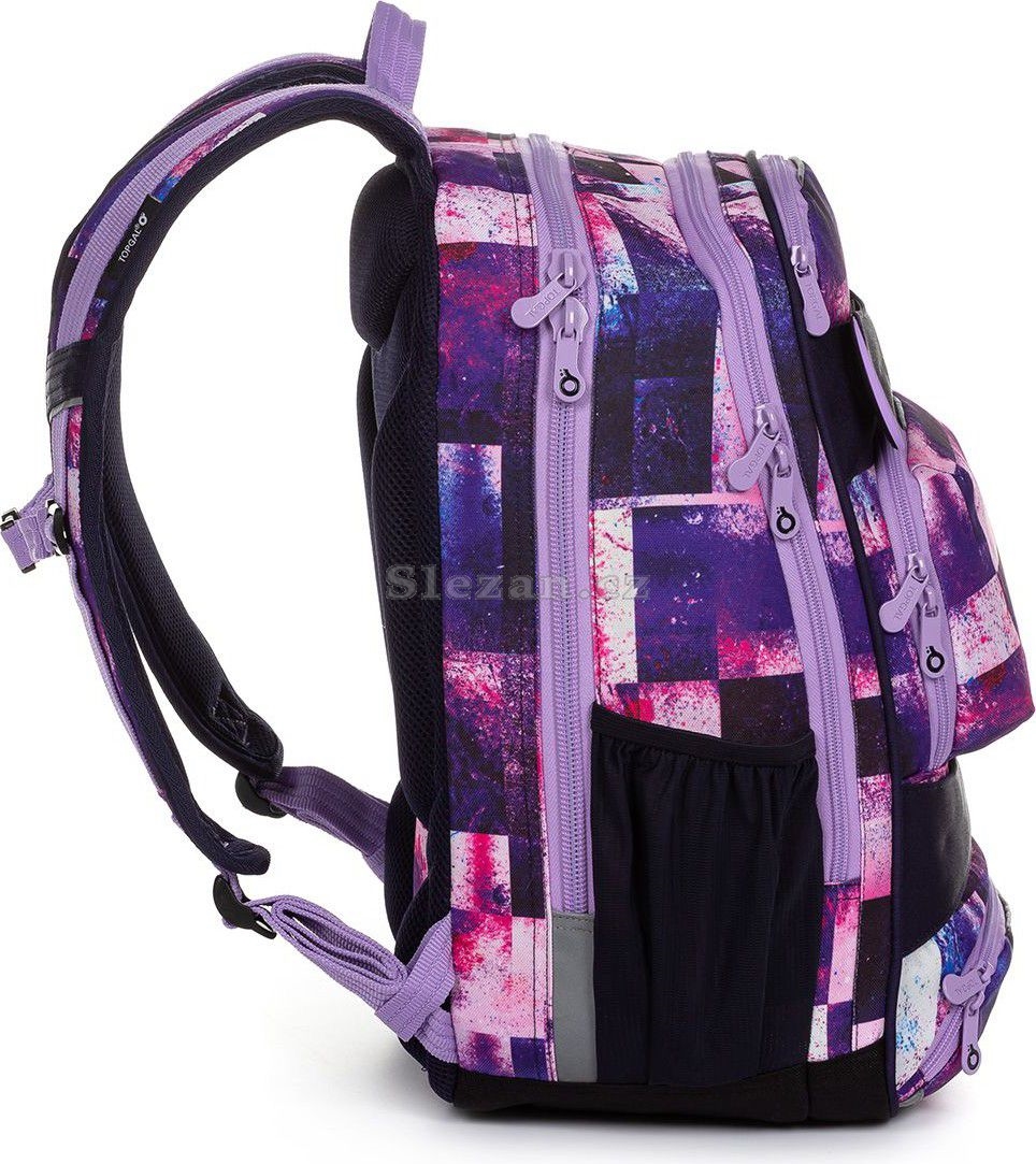 nejoblíbenější střih v novém designu vhodný od 150 cm na ZŠ, SŠ, ale i studentky VŠ pevná záda, velký objem Střih YUMI je prostě naše dvoukomorová stálice. Letos batoh přinášíme v novém růžovo fialovém potisku s tmavě modrými pásy na čele batohu. Kdybyste nevěděli, původně pásy na suchý zip sloužily na přenášení skateboardu, ale dnes si na ně můžete zavěsit prakticky cokoliv. Skate ale samozřejmě taky, takže bude sloužit dobře nejen do školy, ale i na volný čas! Uvnitř batohu je ve dvou objemných komorách spousta místa. Zadní komora je širší a jsou v ní všité dvě polstrované kapsy - užijete je buď na přenášení notebooku do velikosti 15,4”, tabletu, nebo tam dáte prostě složky a sešity A4, které nechcete, aby se zmuchlaly. Menší kapsa je fajn třeba na telefon, nebo powerbanku. Nebo ji využijete na kosmetiku? No proč ne… Přední komora je o něco užší, ale je v ní ještě síťová kapsa na zip a karabina na klíče. Všechny další drobnosti jde skládat do tří menších kapsiček na čele batohu. Na obou bocích batohu jsou síťové kapsy na lahev na pití - jedna z nich je doplněna kompresním popruhem, takže se do ní vejde pohodlně i větší PETka. Reflexní prvky na batohu jsou umístěné tak, že si jich na první pohled skoro nevšimnete. Jsou ale na čele, bocích i na ramenních popruzích batohu. Ty jsou polstrované, tvarované a utahovatelné, takže můžete nosit denně i těžký náklad. Záda batohu jsou anatomicky tvarovaná a polstrovaná, vyztužena hliníkovým prutem, který drží správný anatomický tvar zad batohu. Něco navíc: zátěr proti dešti kovové taháčky pevné nepropustné dno z TOPDURY poutko na přenášení batohu v ruce PS: K batohu můžete dokoupit v setu nebo zvlášť i oválný penál ETUE 20033 ve stejném designu.