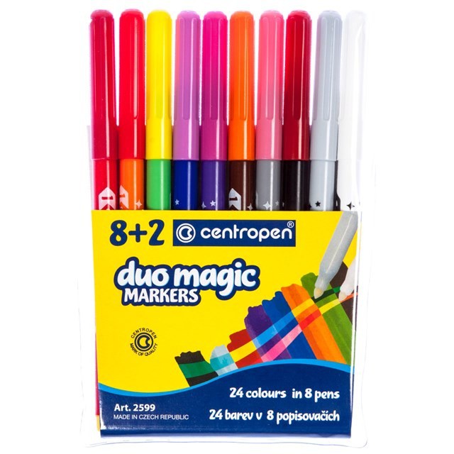Popisovače magické Duomagic jsou osazeny válcovými hroty, které umožňují šíři stopy písma 1,8 mm.