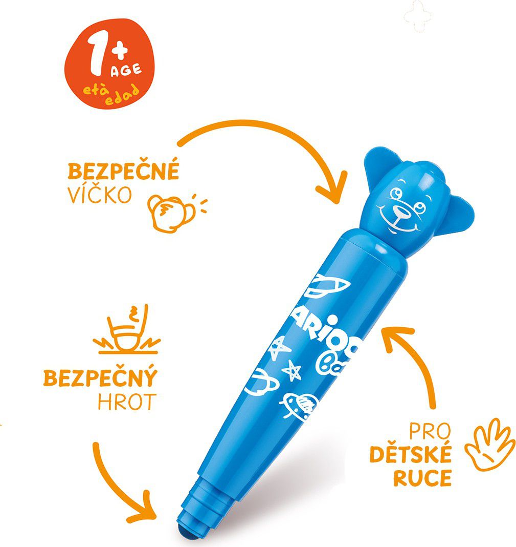 Fixy, které milují nejmenší umělci i jejich rodiče. Poutavý motiv a ergonomický tvar těla perfektně padne do dětských ručiček. Netoxický inkoust snadno odstraníte vodou a mýdlem z pokožky i textilu, takže se nemusíte bát nepořádku. Dermatologicky testované pro maximální šetrnost. Bezpečný zakulacený hrot usnadňuje práci malých umělců a je odolný vůči zatlačení a poškození. U dětí mladších 3 let doporučujeme dohled dospělé osoby.