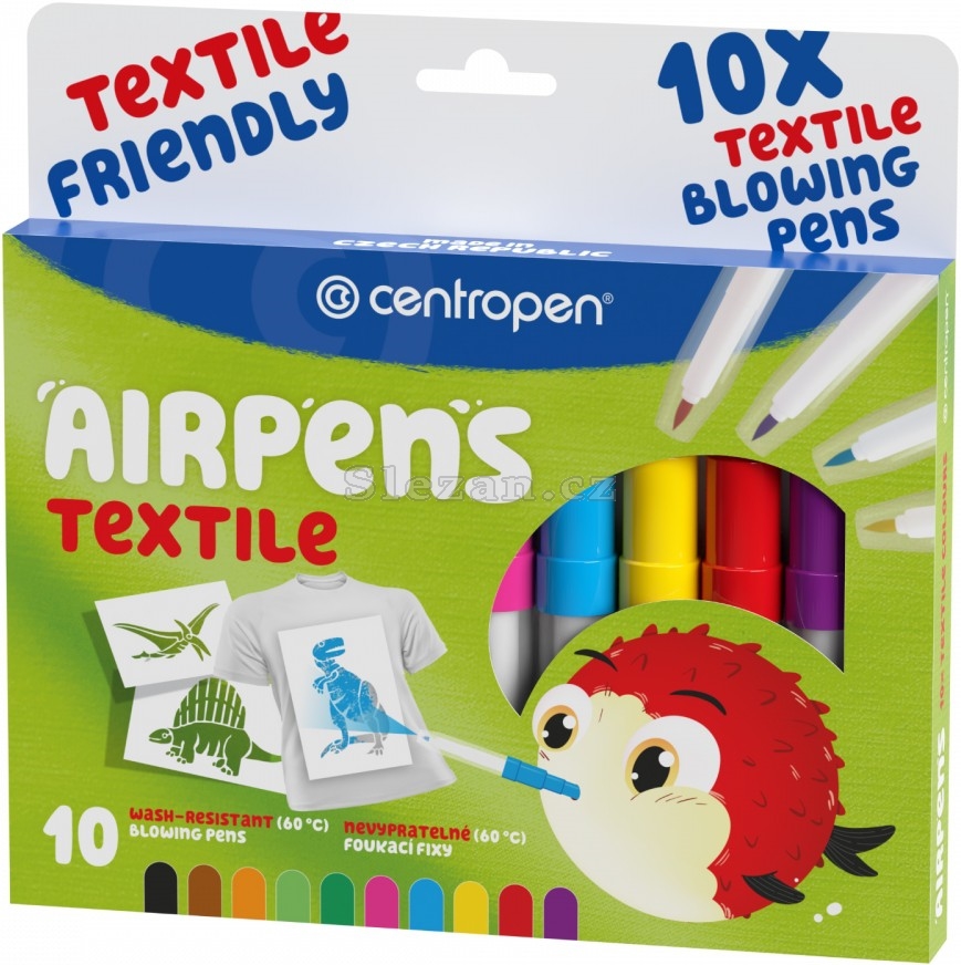 Foukací fixy na textil. Inkoust zdravotně nezávadný odolávající odolávající teplotě praní do 60°C.