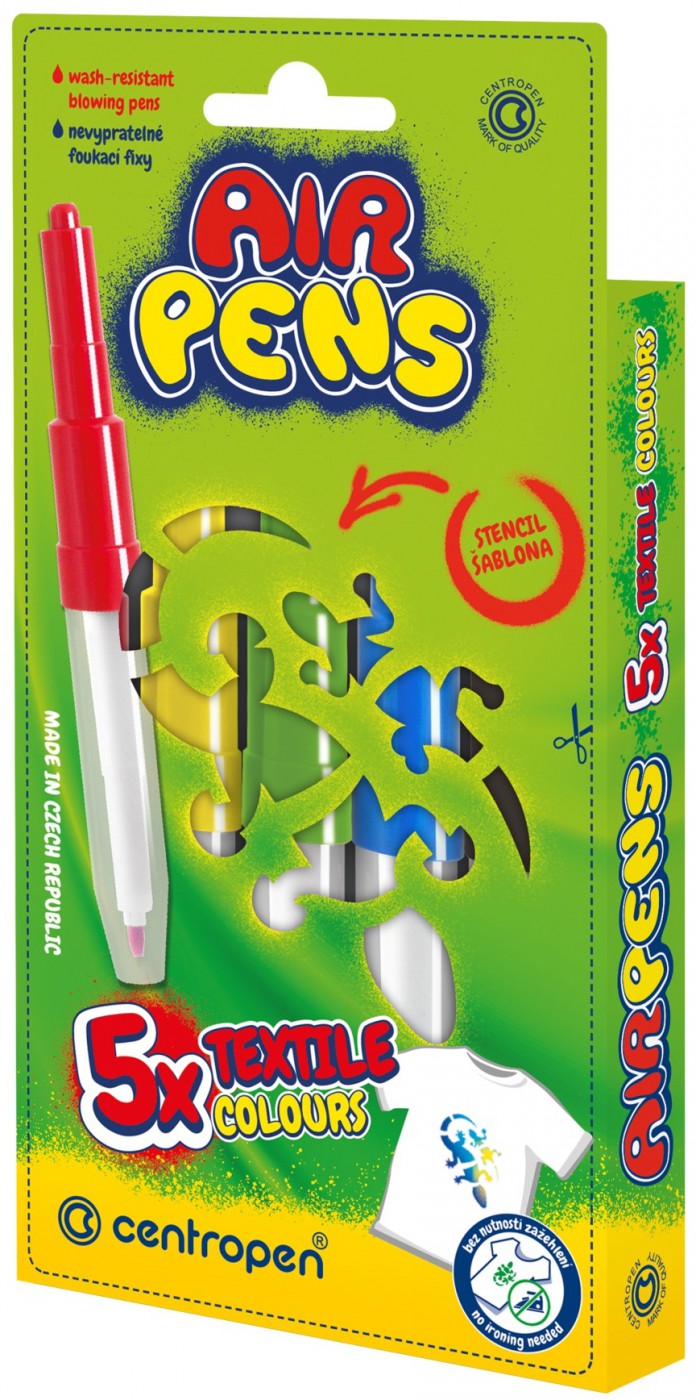 Foukací fixy na textil. Inkoust zdravotně nezávadný odolávající teplotě praní do 60°C. 5 barevných odstínů a 1 šablona.