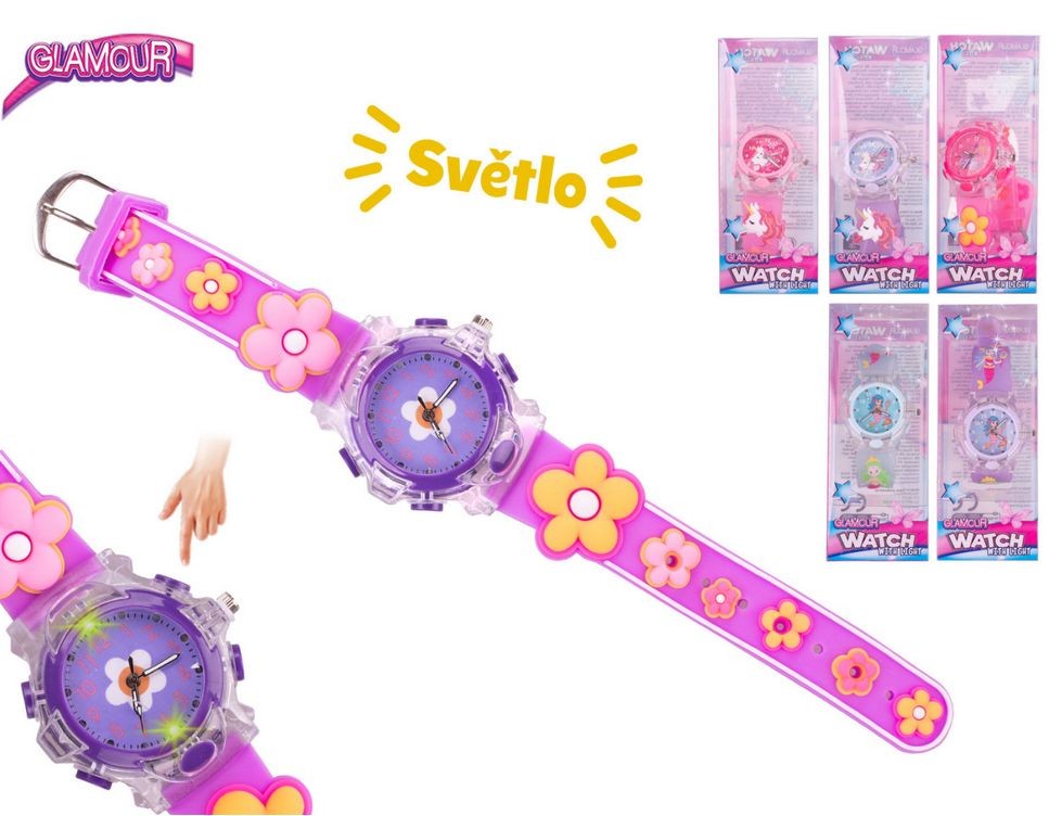 Popis Glamour hodinky náramkové analogové dívčí na baterie se světlem, 6 druhů v krabičce