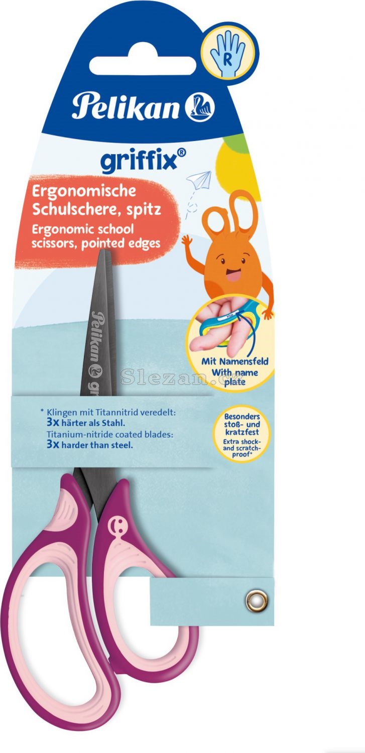 kulatá čepel, 3 x silnější než normální nůžky a to díky nitrid titanu, ergonomická rukojeť, pro praváky,indikátor správného držení (smajlík), jmenovka, 25 let záruka, fialová, na Blistru