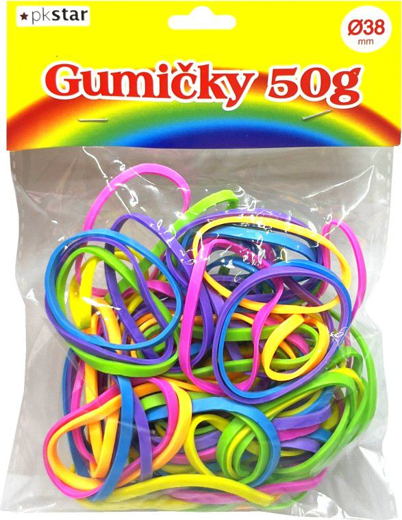 Balení barevných gumiček o průměru 38 mm.