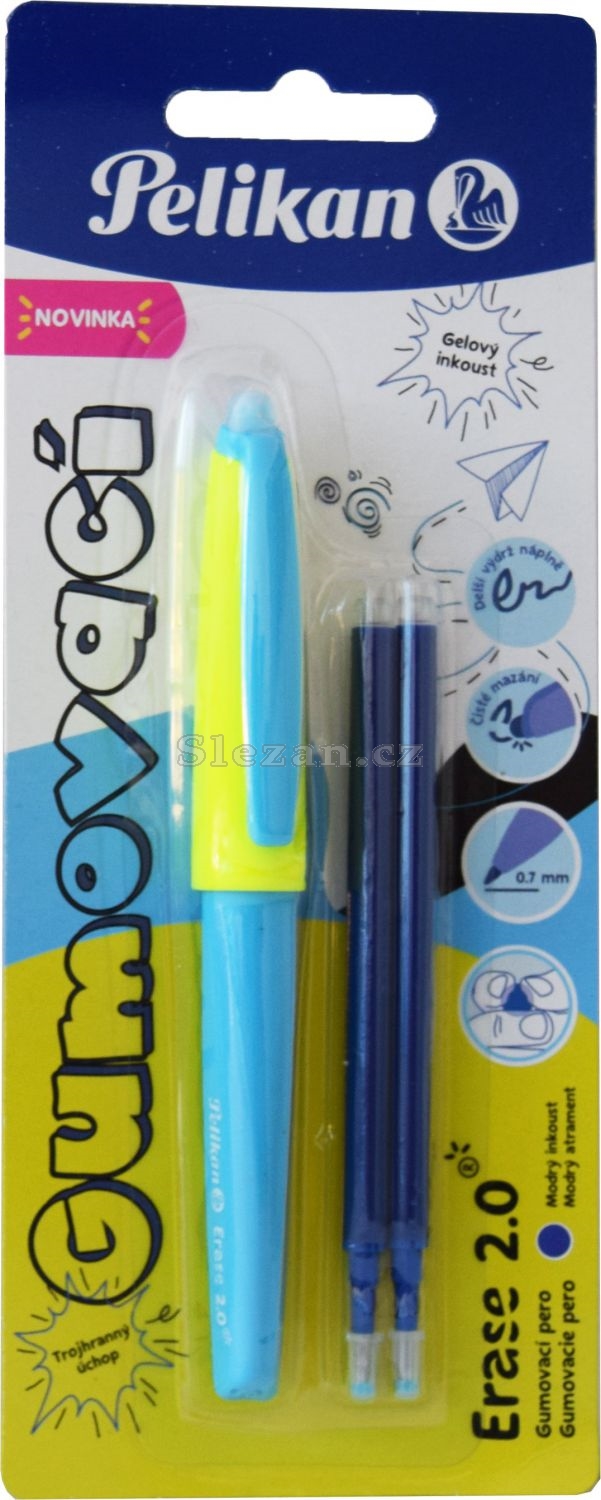 Gelové pero s trojhranným úchopem, se šířkou stopy 0.7mm, barva náplně modrá, s uzávěrem, materiál plast, inkoust gumovací, pro praváky i leváky, vyměnitelná náplň, 1 ks + 2 ks náplně na blistru