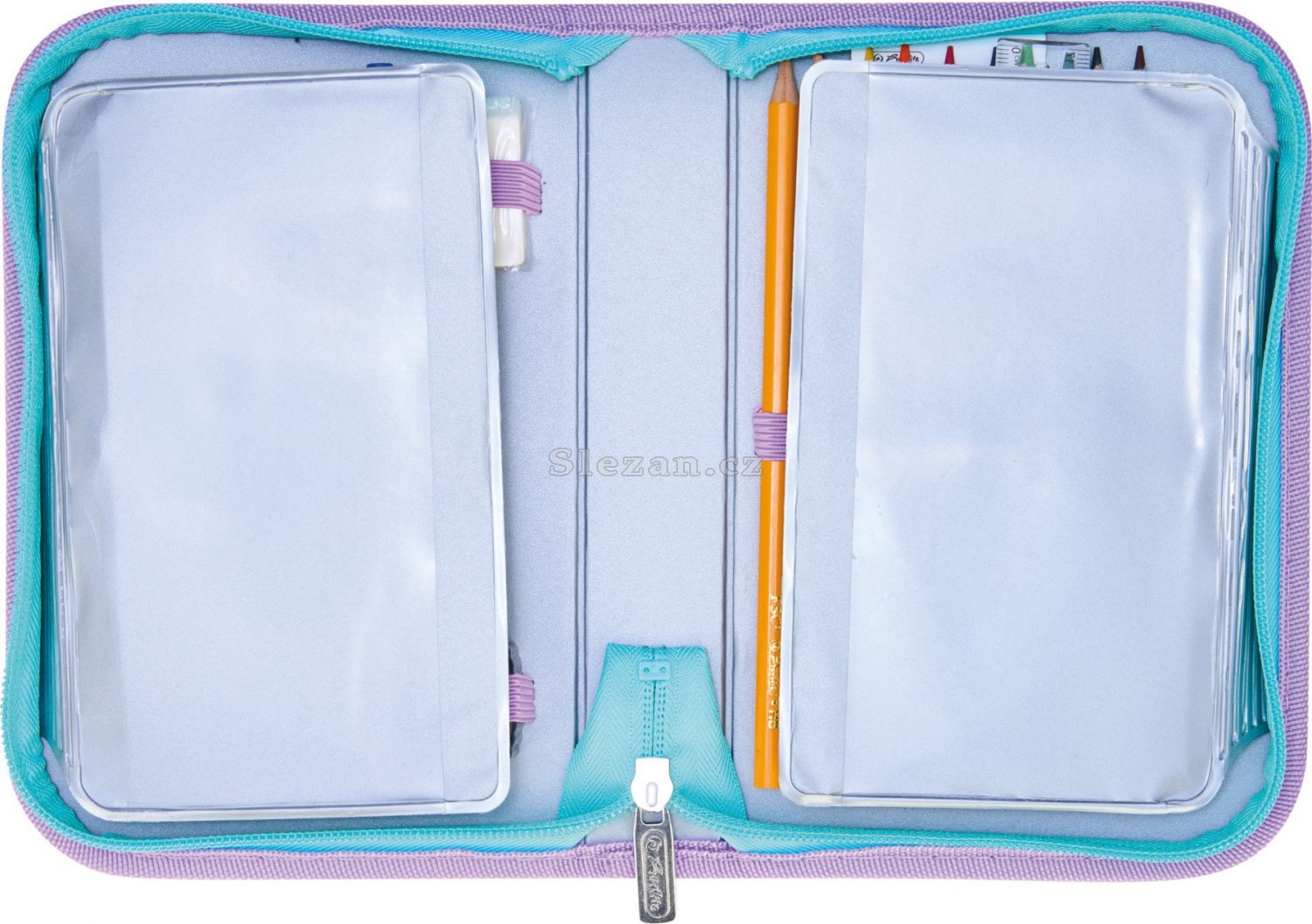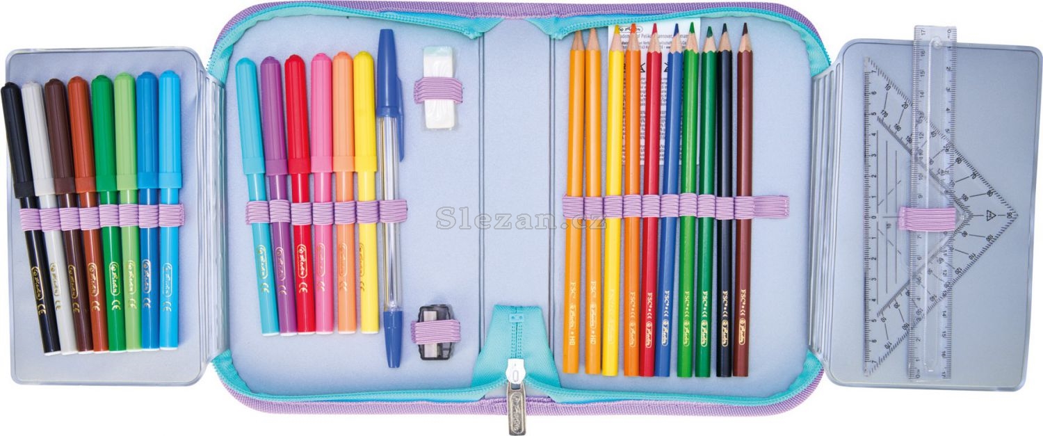náplň: 14 fixů, 8 šestihranných pastelek, 2 tužky šestihranné, 1 plastové ořezávátko, 1 guma, 1 plastové pravítko 16 cm, 1 trojúhelníková geometrie, 1 kuličkové pero, 1 rozvrh, 1 vizitka