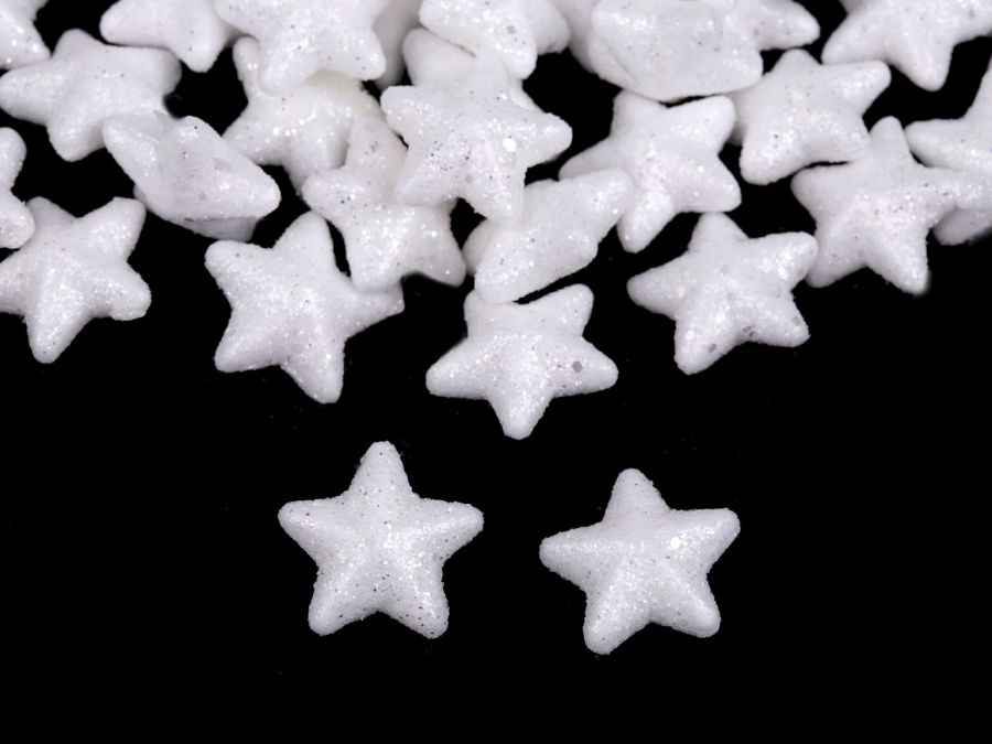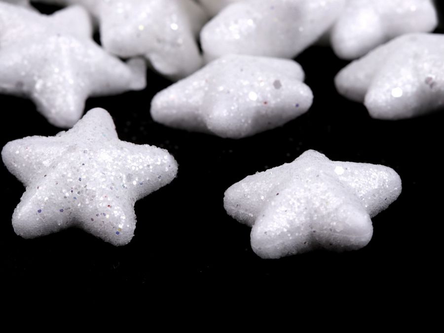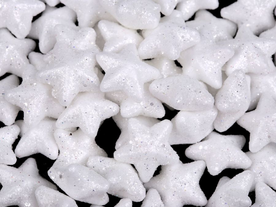 Polystyrenové mini hvězdičky jsou lehoučké a z obou stran se díky glitrům třpytí. Využijete je převážně k zimnímu a vánočnímu aranžování.