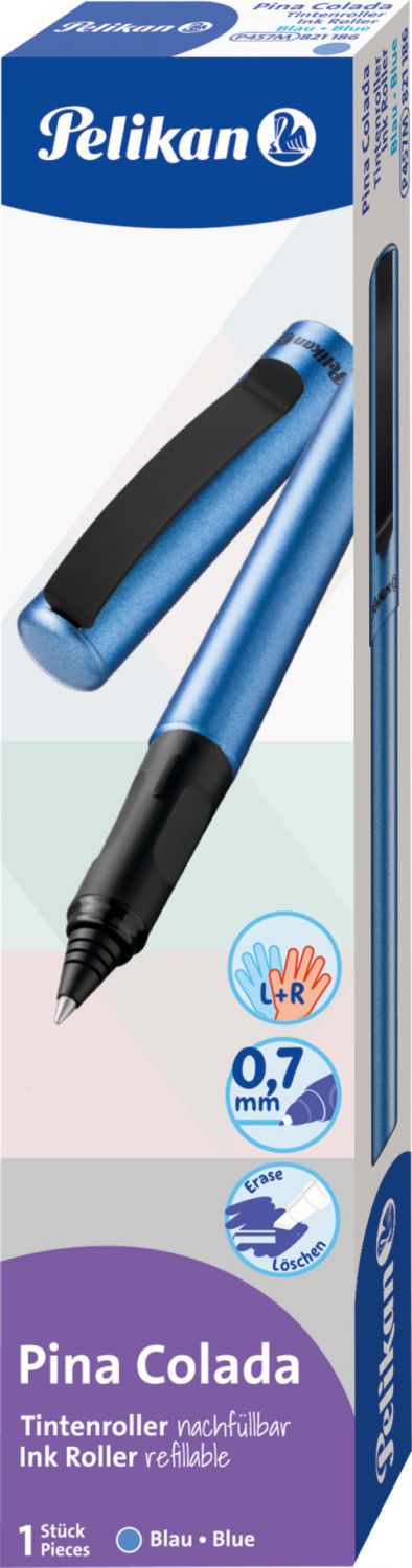 nkoustový roller Pina Colada modrý metalický lak, vhodné pro praváky i leváky,náplň 1 inkoustová bombička, inkoust je smazatelný, balené v krabičce.