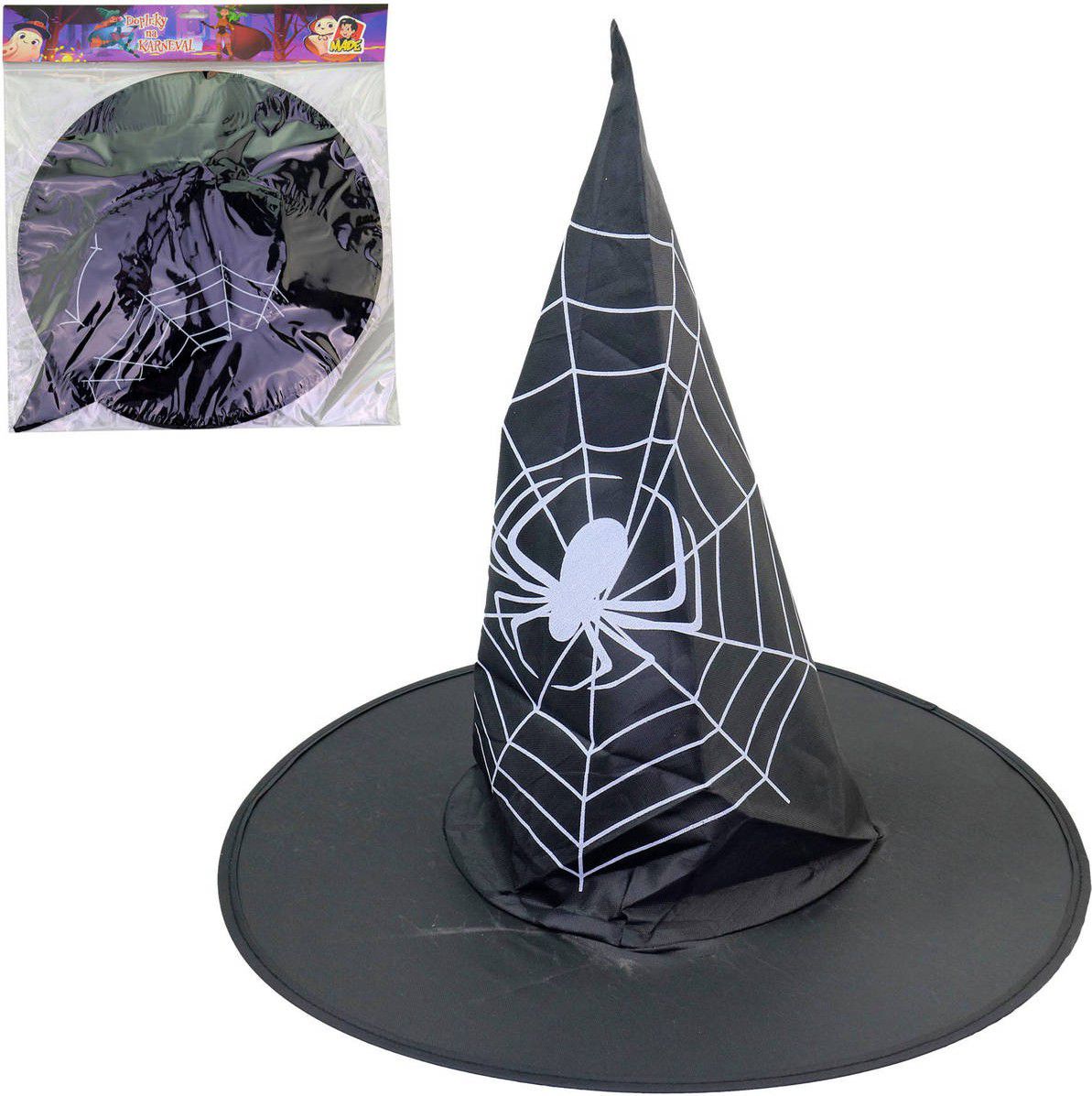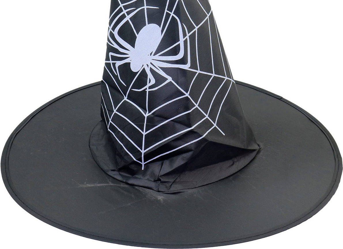 Špičatý černý klobouk pro čarodějnice a čaroděje. Bílý potisk pavučina s pavoukem, doplněk ke kostýmu Čarodějnice, na karneval.