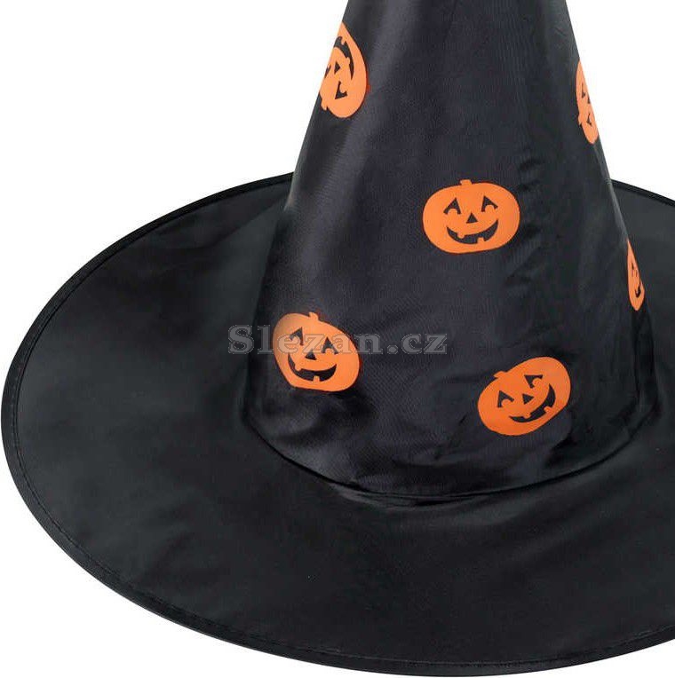 Úžasný špičatý čarodějnický klobouk v černé barvě s potiskem oranžových dýní. Ideální na halloweenský večírek nebo karneval!