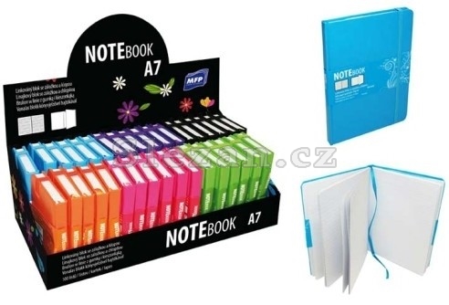 Linkovaný poznámkový blok A7 se zaoblenými rohy. Zápisník je opatřený gumičkou proti samovolnému otevření a záložkou. Na vnitřní zadní straně je papírová kapsička. Provedení v pestrých barvách - modré, růžové, fialové, zelené, oranžové a černé. 70g/1