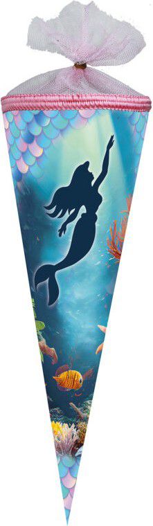 Papírový školní kornouty kulatý o výšce 35 cm s tylovým lemem.
