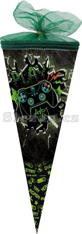 Papírový školní kornout kulatý o výšce 35 cm s tylovým lemem.