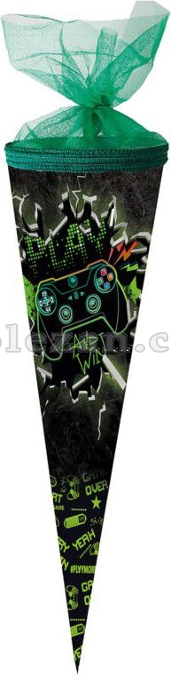 Papírový školní kornout kulatý o výšce 50 cm s tylovým lemem.
