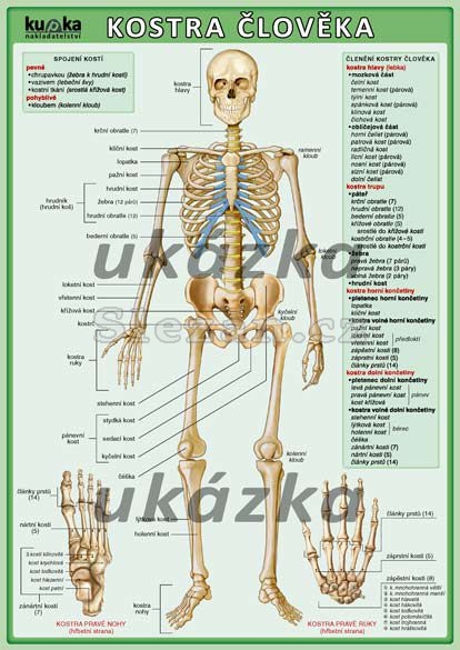 Detailní anatomické nákresy kosterní soustavy člověka.