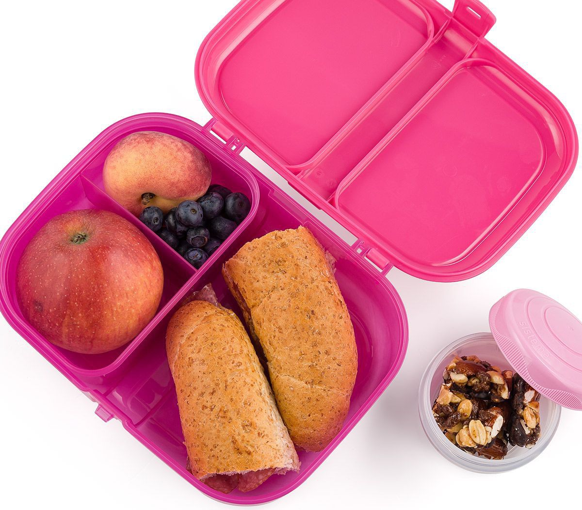 Díky vyjímatelnému organizéru oddělíte suchou část svačinky od mokré (například pečivo od ovoce). Jogurt, oříšky nebo granolu můžete separovat do dózy se šroubovacím víčkem.