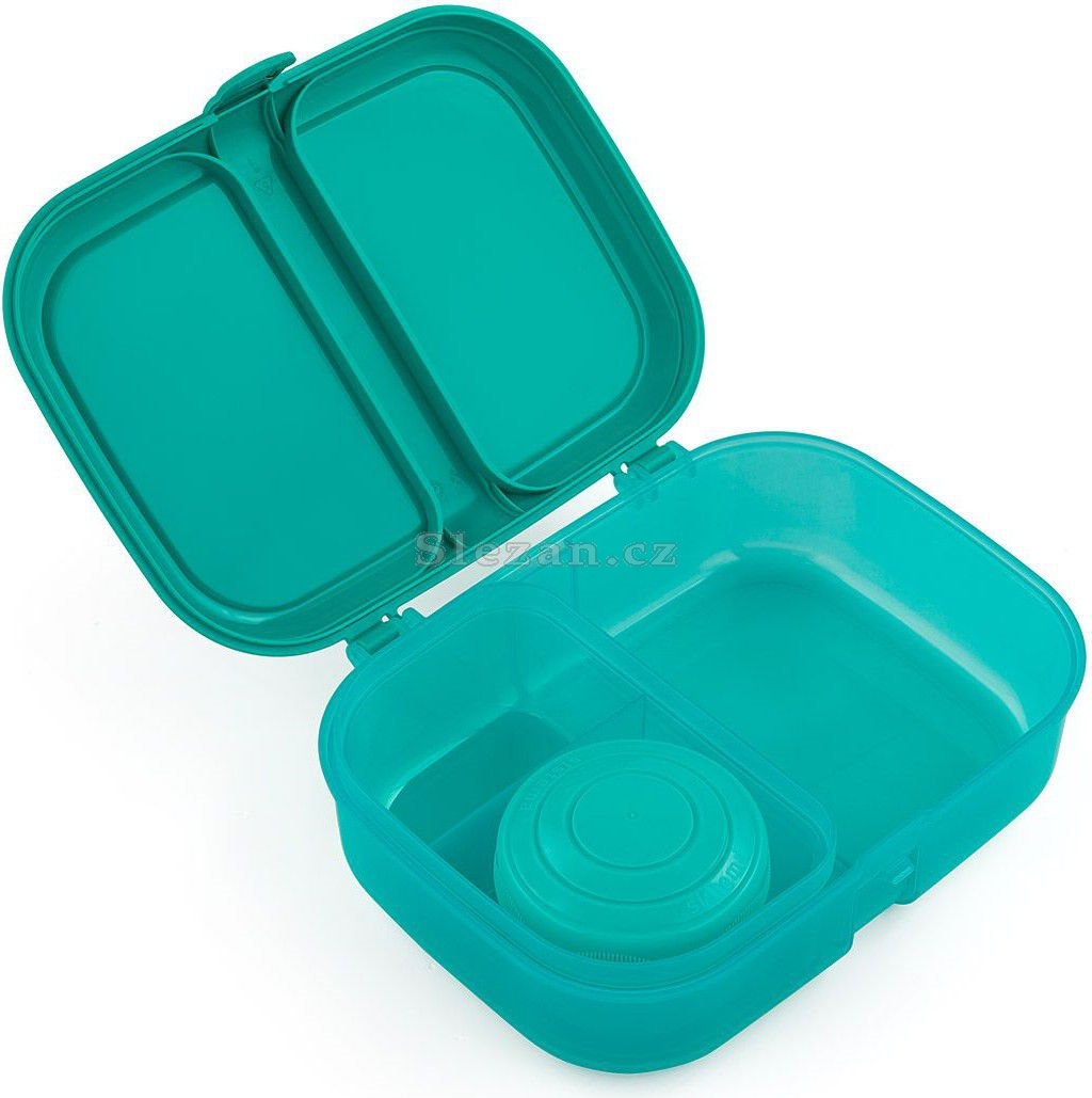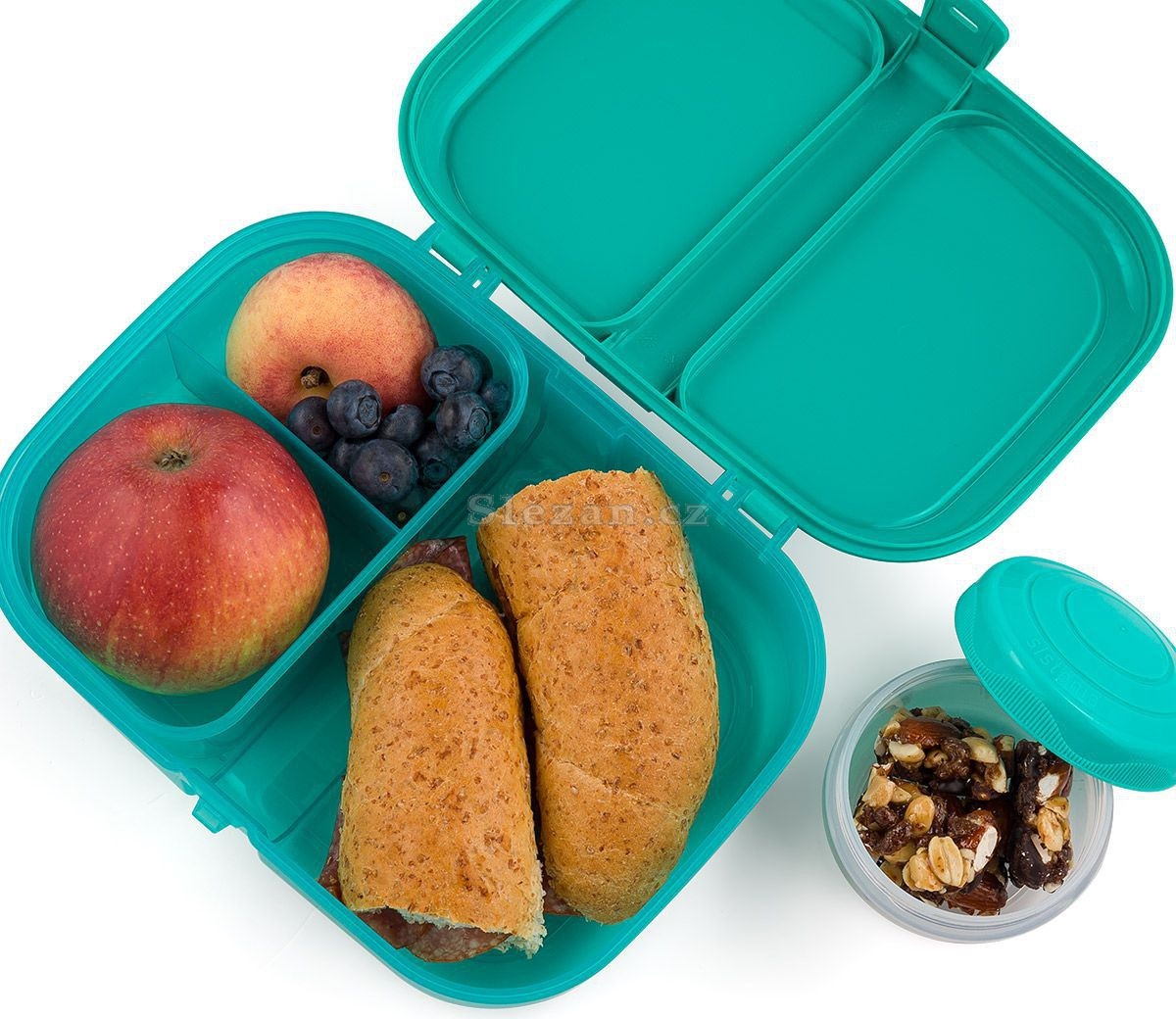Díky vyjímatelnému organizéru oddělíte suchou část svačinky od mokré (například pečivo od ovoce). Jogurt, oříšky nebo granolu můžete separovat do dózy se šroubovacím víčkem.