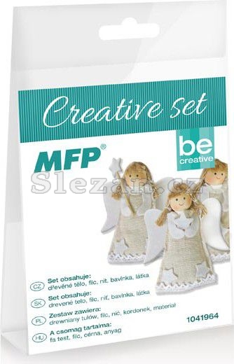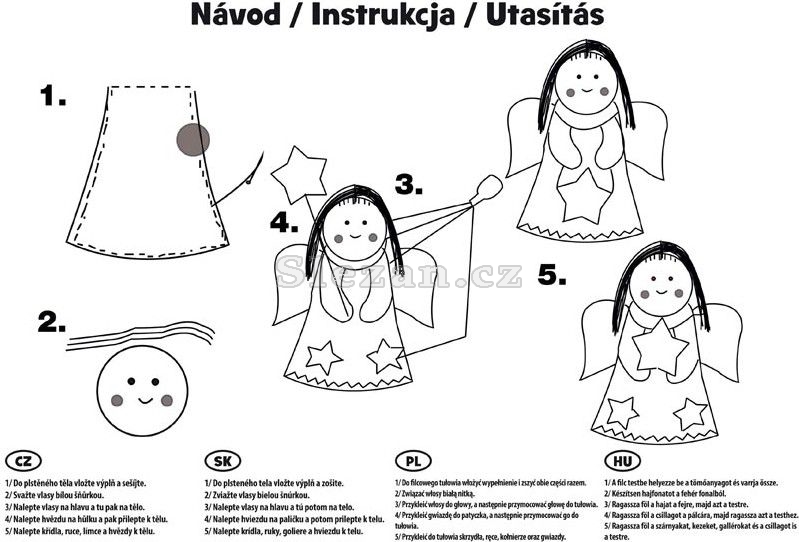 NÁVOD:1. Do plstěného těla vložte výplň a sešíjte. 2. Svažte vlasy bílou šňůrkou. 3. Nalepte vlasy na hlavu a tu pak na tělo. 4. Nalepte hvězdu na hůlku a pak přilepte k tělu. 5. Nalepte křídla, ruce, límce a hvězdy k tělu.