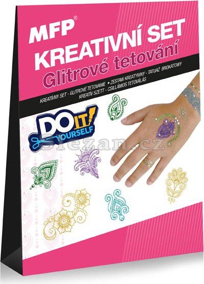 Kreativní set - glitrové tetování. BALENÍ OBSAHUJE: - 14 x tetovací šablona na 2 arších - 4 x glitrový pudr - 1 x štěteček - 1 g stříbrné glitry - 1 x návod k použití NÁVOD K POUŽITÍ: 1. vystřihneme šablonu 2. nalepíme šablonu na hladkou, čistou a suchou kůži 3. nalepíme stříbrné třpytky 4. šablonu posypeme glitrovým pudrem a rozetřeme štětečkem po celé šabloně