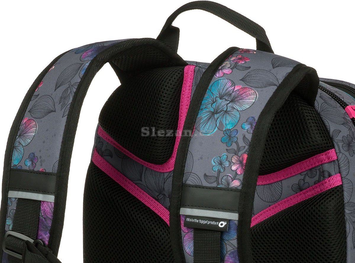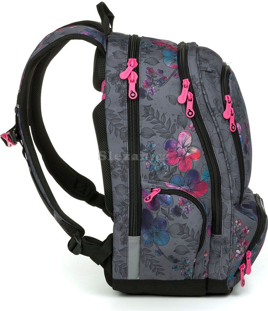 Praktický, objemný, dvoukomorový střih studentského batohu pro dívky SURI u nás letos zažívá renesanci díky novému jemnému potisku s kytičkami. Šedou základní barvu jsme lehce doplnili o detaily v růžových a modrých odstínech. Snad se bude líbit slečnám na druhém stupni ZŠ, ale i starším studentkám, středoškolačkám.
