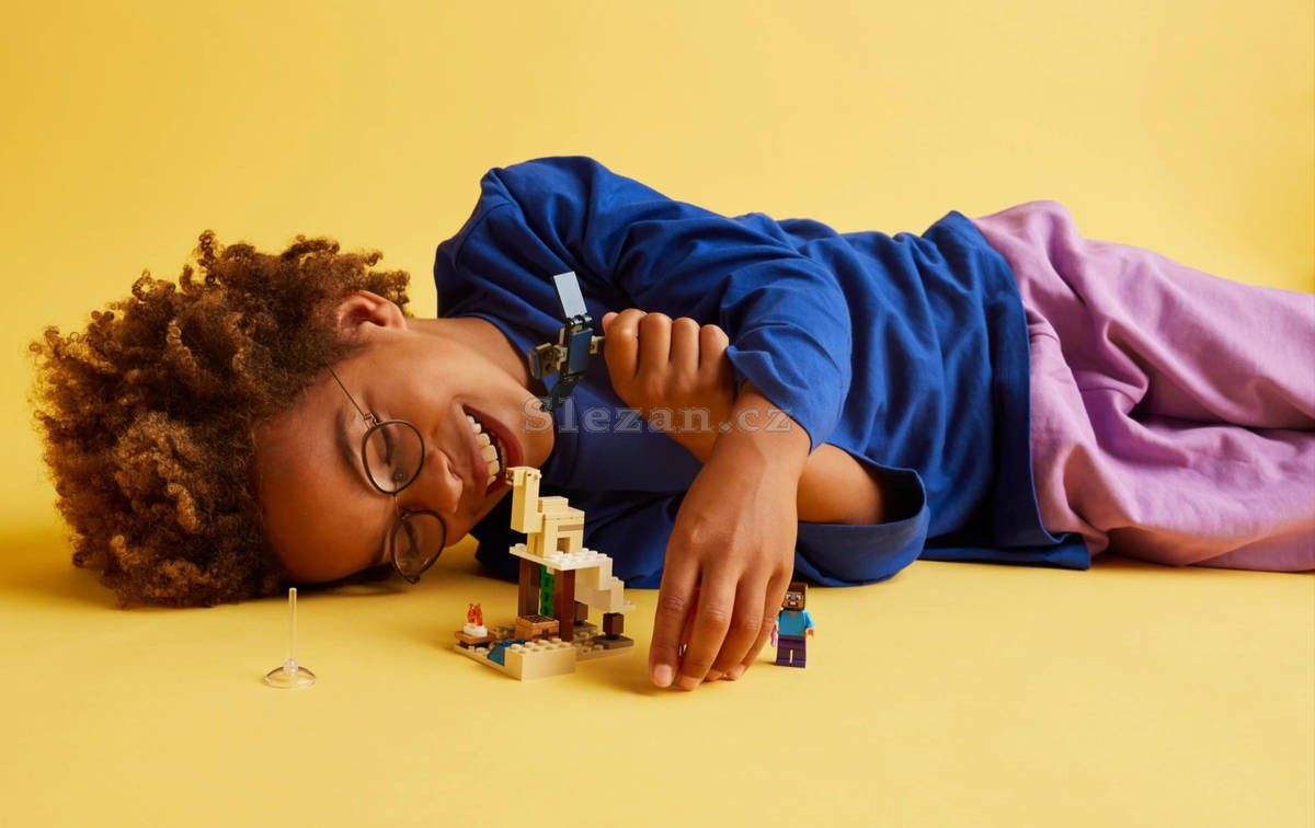 Tato stavebnice pro malé stavitele od 6 let je zcela první sada s biomem pouště ze světa Minecraftu. Steve a výprava do pouště děti inspiruje k postavení domku v nehostinném prostředí, který poté musí ubránit před létajícím Přízrakem. V této přestavitelné herní stavebnici pro děti od 6 let najdete 3 figurky LEGO Minecraft, včetně Stevea, a domek v poušti. Součástí sady jsou také proslulé prvky ze hry Minecraft, jako je pracovní stůl, táborák a řada dílků pro sestavení pouště. Jedná se o skvělý dárek pro fanoušky Minecraftu, který přímo vyzývá k tvořivým dobrodružstvím a akčním bitvám, když základnu napadne létající Přízrak s pohyblivými křídly. Zcela poprvé se ve stavebnici LEGO Minecraft objevuje mládě velblouda a nechybí ani nová verze Steveovy tváře. Sadu lze kombinovat s dalšími stavebnicemi z řady LEGO Minecraft (prodávají se samostatně) a představuje skvělý dárek pro děti i milovníky videoher.