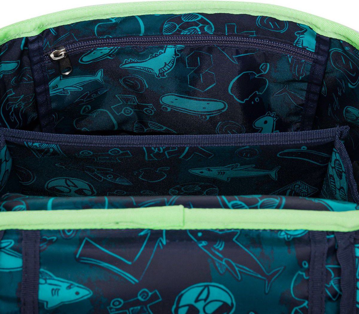 V objemné hlavní kapse najdete organizér, dvě malé kapsy na drobnosti a jmenovku. Po stranách jsou dvě pevné kapsy na lahev ZIVA o objemu 0,5 litru. Do přední kapsy jsme přidali odnímatelnou karabinu na klíče, s kvěle se tam vejde také penál PENN 25011 ve stejném designu, nebo naše krabičky na svačiny s vyjímatelným organizérem.