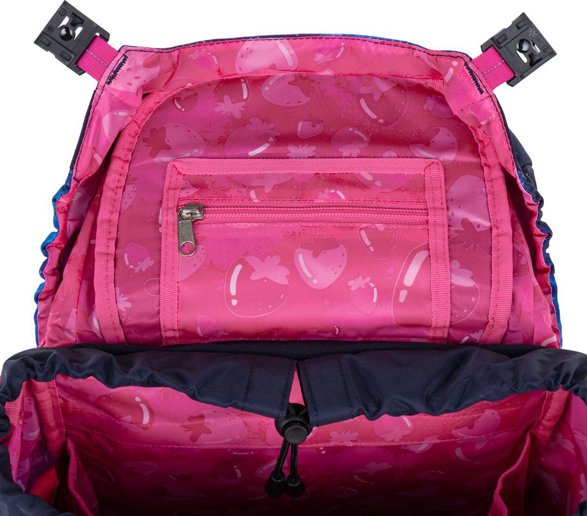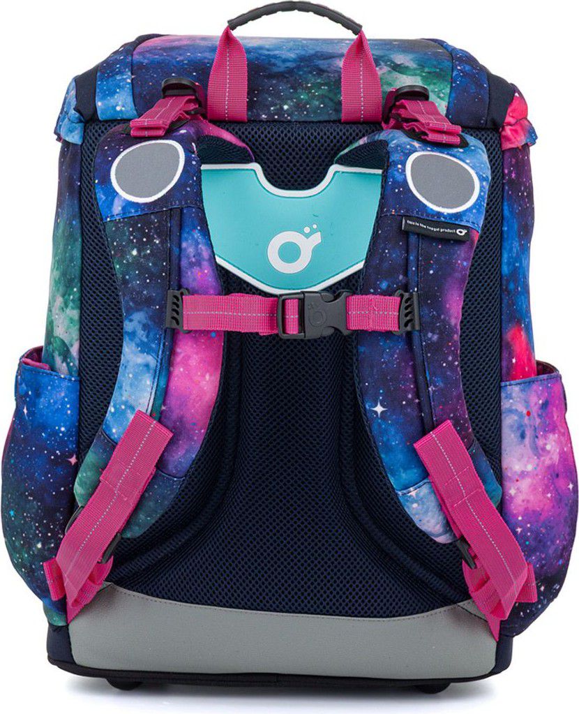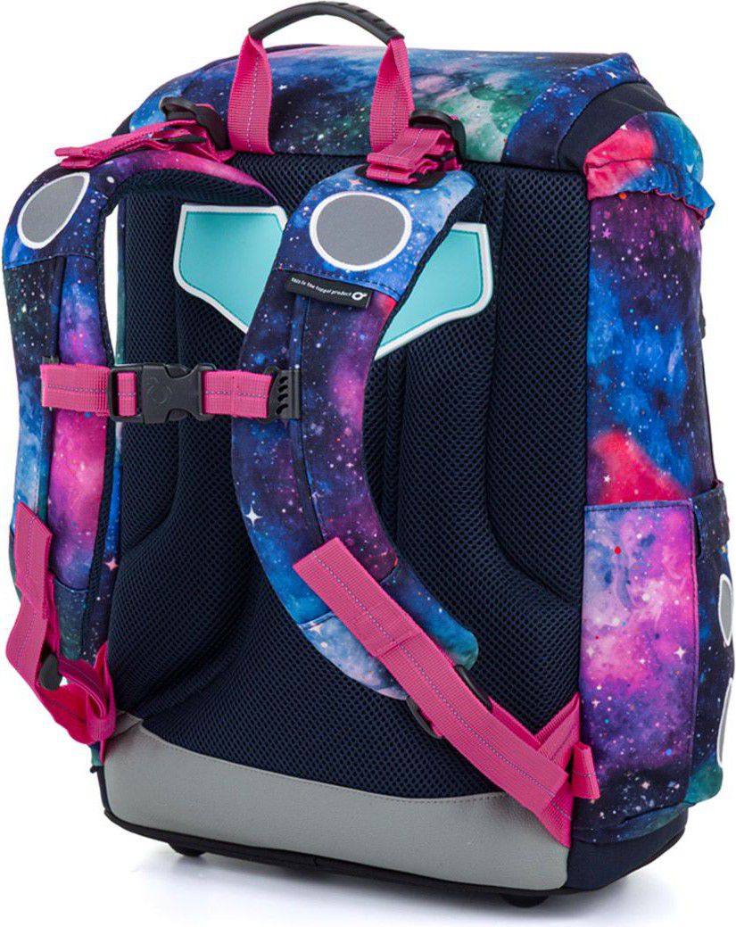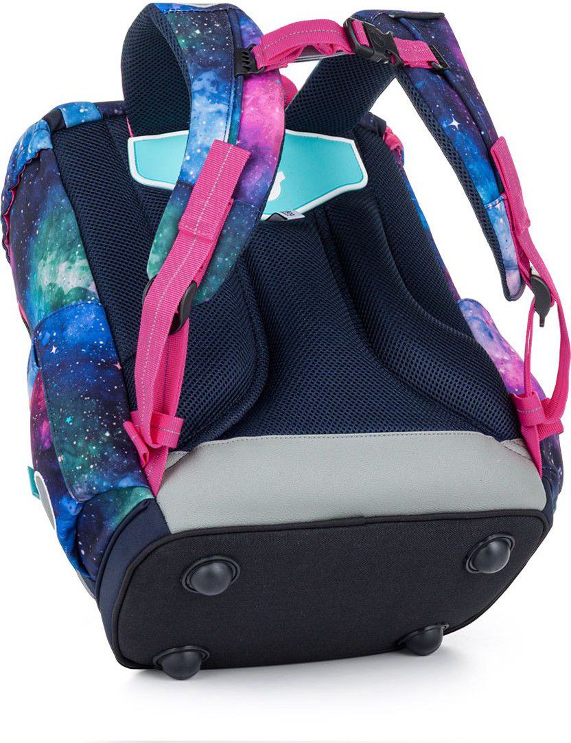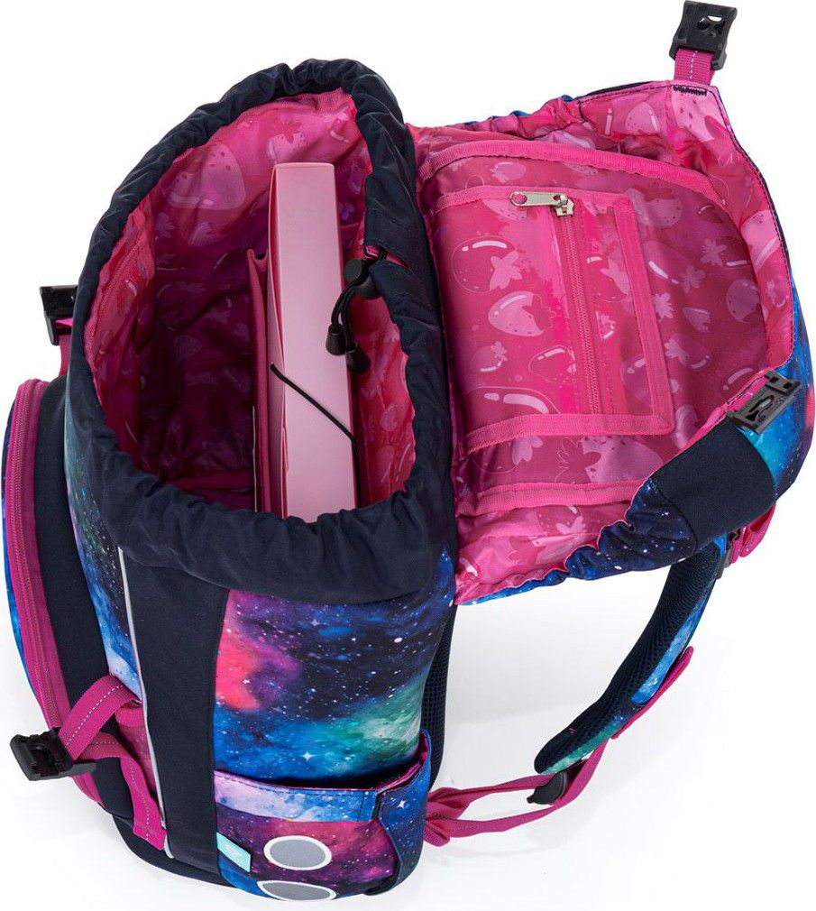 Vesmírný motiv v odstínech modré, fialové a růžové doplňuje hravý magnet s malou kosmonautkou, který krásně ladí s celým designem aktovky. Vyměnitelné magnety ZMAG si může vaše školačka měnit podle nálady, což dává aktovce ještě hravější a originálnější vzhled.