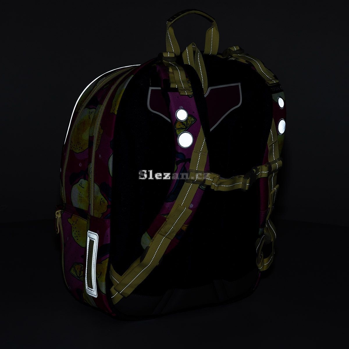 Batoh má dvě hlavní objemné komory, které pojmou všechno potřebné učení. Zadní komora batohu je užší než přední, radíme do ní umístit nejtěžší učivo a směrem dopředu odlehčovat. V přední, širší komoře, je umístěna síťová kapsa na zip a jmenovka. Do přední hluboké kapsy na čele batohu umístíte třeba krabičku se svačinkou, nebo penál ve stejném designu. V kapse je umístěna i odnímatelná karabina na klíče.