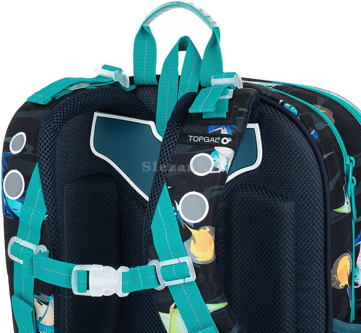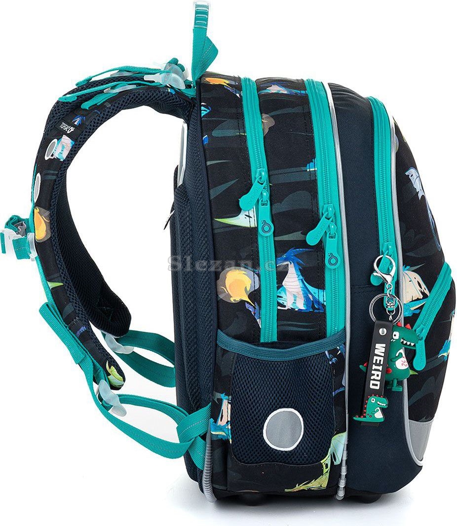 Batoh má dvě hlavní objemné komory. Zadní komora batohu je širší, radíme do ní umístit nejtěžší učivo a směrem dopředu odlehčovat. V přední komoře je umístěna síťová kapsa na zip a jmenovka. Do přední hluboké kapsy na čele batohu se vejde třeba krabička na svačinku, nebo penál ve stejném designu. Do bočních kapes se vejdou lahvičky o objemu 0,5 litru.